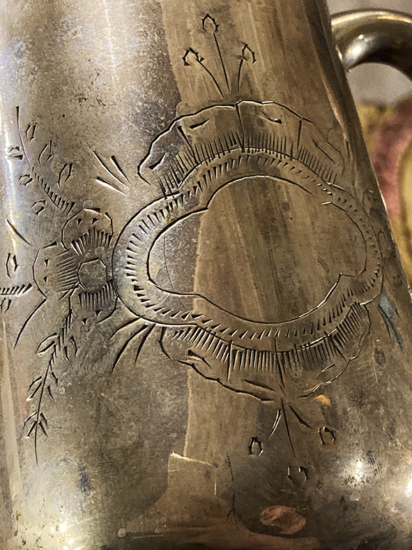 這件來自英國的古董鍍銀手工刻花杯,屬於19世紀末至20世紀初的維多利亞風格啤酒杯(Tankard)。杯身以 E.P.N.S.(Electro Plated Nickel Silver,電鍍鎳銀) 製成,具有厚實穩重的手感,並以手工刻花描繪花卉與花環紋飾,細膩優雅。圓弧狀的把手結構堅固,方便抓握,杯底寬厚平穩,展現當時英式日常器皿的實用與美感並重。