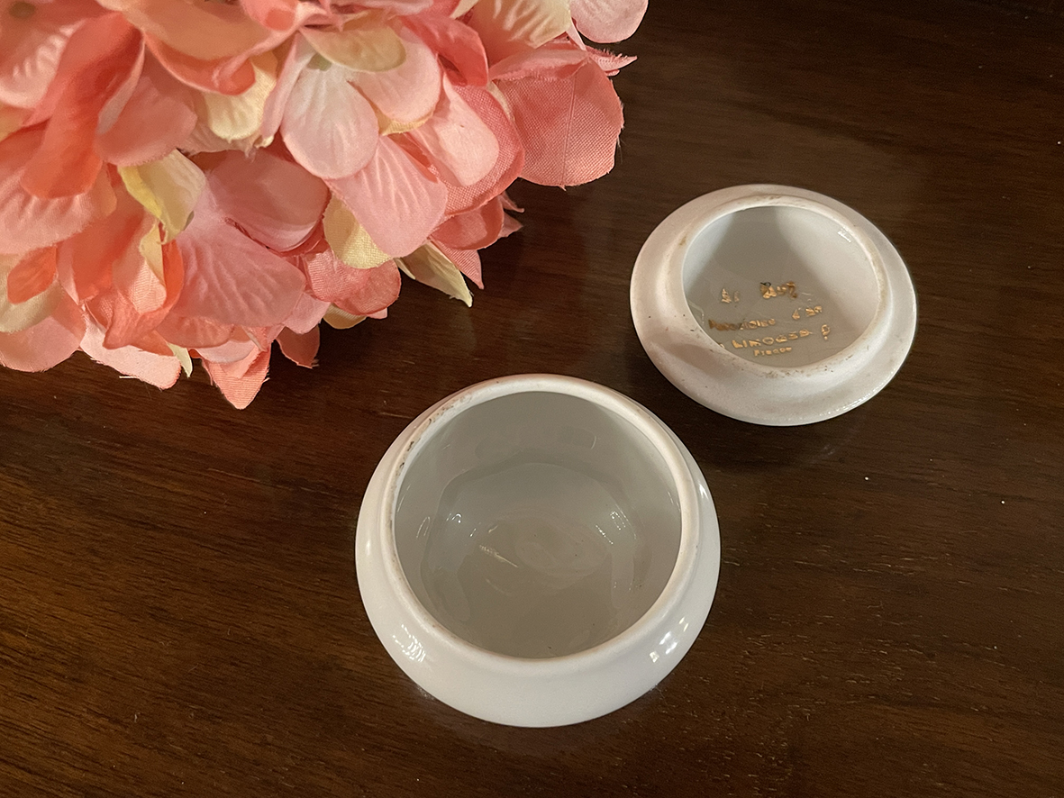 這件小巧的瓷質飾品盒來自法國 Limoges,手工繪製的淡粉色玫瑰,花瓣層疊細緻,搭配柔和的綠葉,展現19-20世紀 Limoges 瓷器一貫的浪漫與優雅。