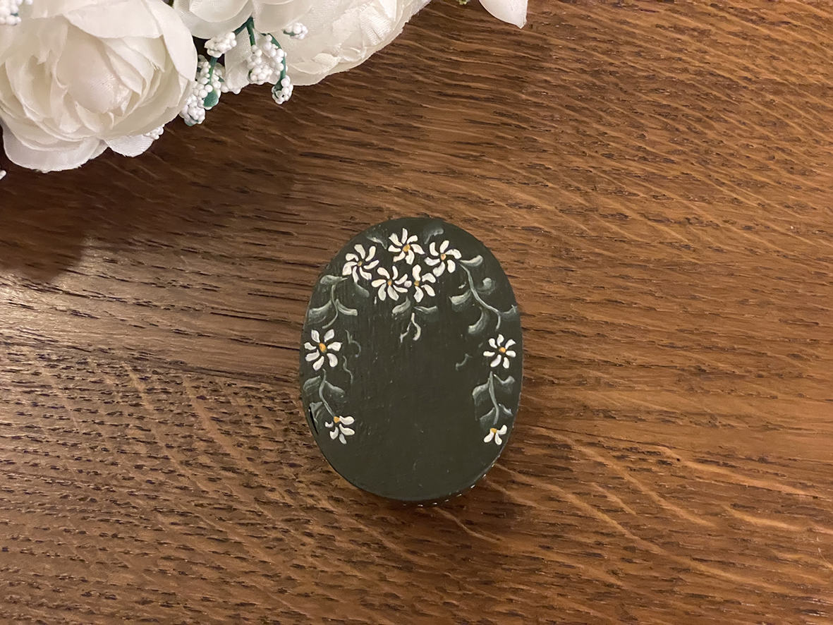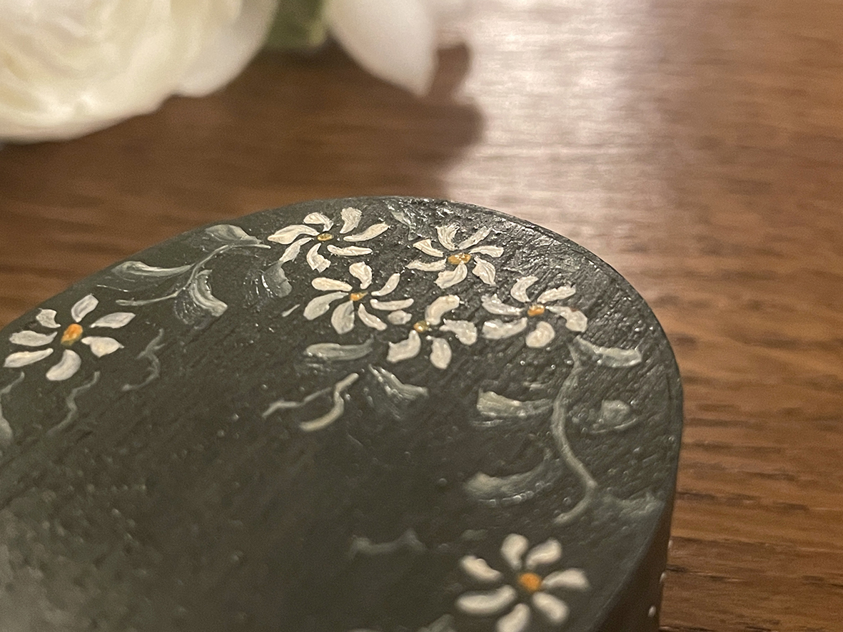 這件來自義大利的手工小木盒,以溫潤的深色木質雕琢成形,盒面以細膩的手工彩繪描繪出白色小花與綠葉,點綴橙黃色花蕊,展現出清新自然的田園氣息。