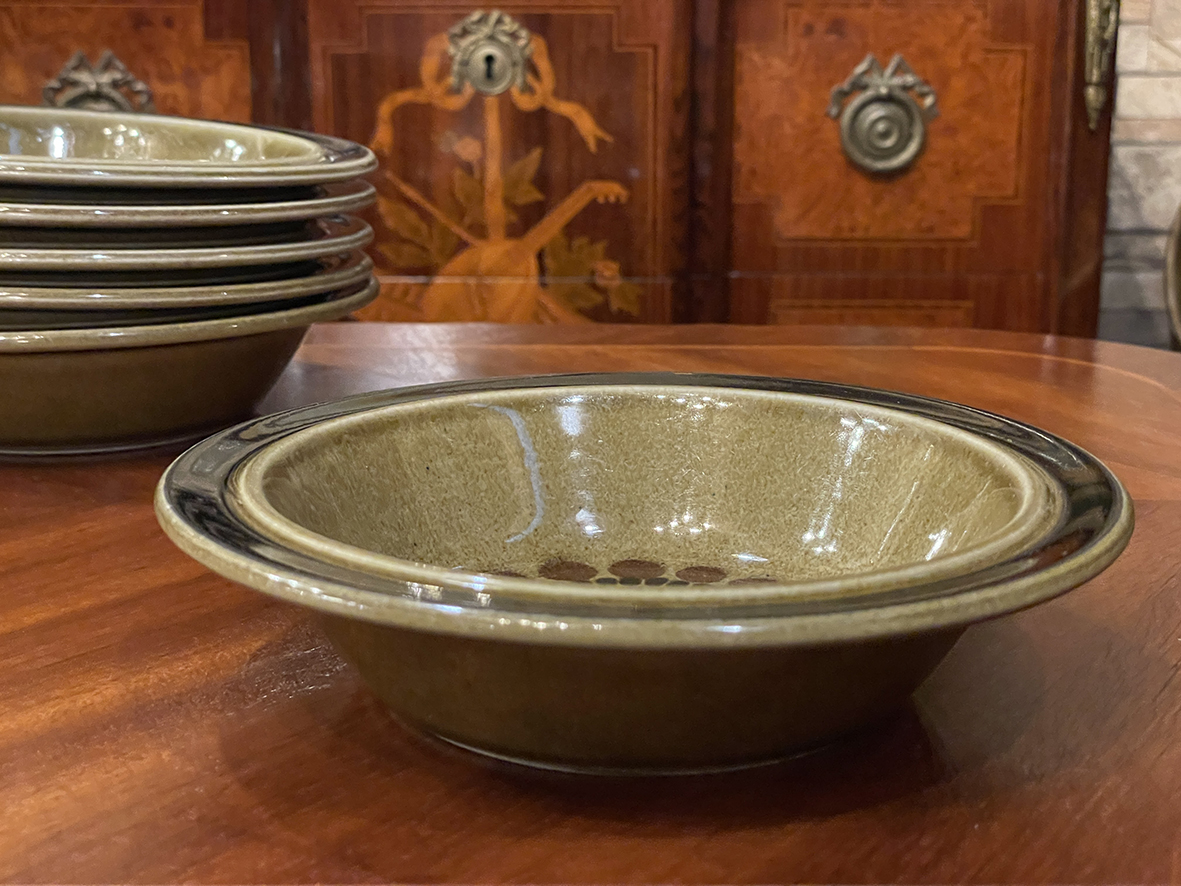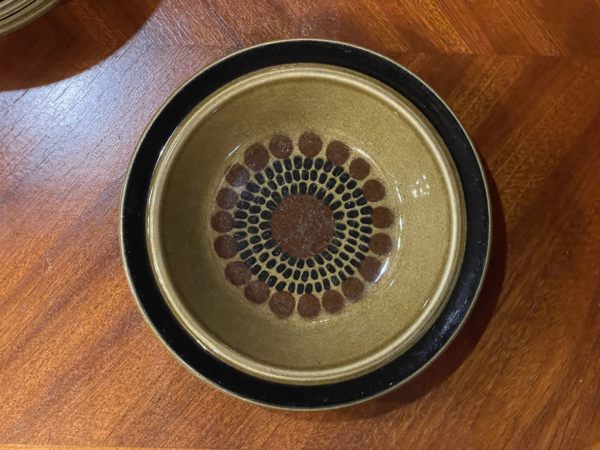 這組出自芬蘭 Arabia 知名的 KOSMOS 系列,為 20 世紀中期斯堪地那維亞設計經典。由設計師 Gunvor Olin-Grönqvist 與 Ulla Procopé 聯手創作,以橄欖綠釉搭配放射狀褐色幾何花卉圖騰,展現北歐餐具樸實又具藝術感的美學。