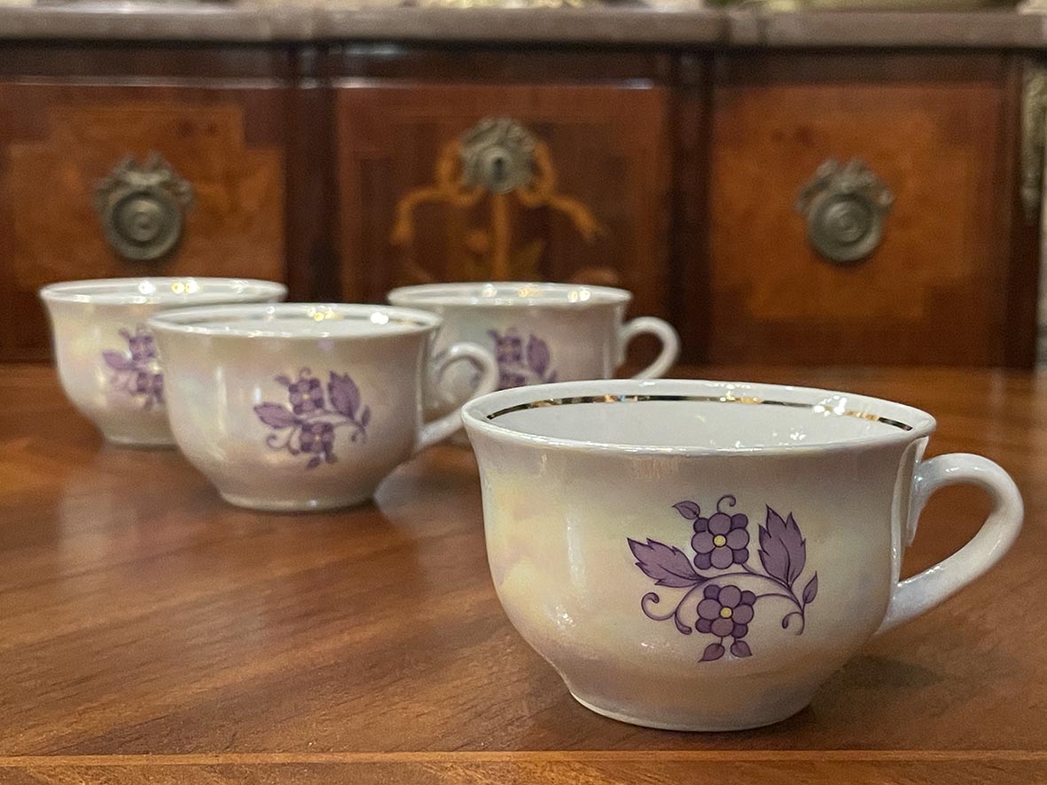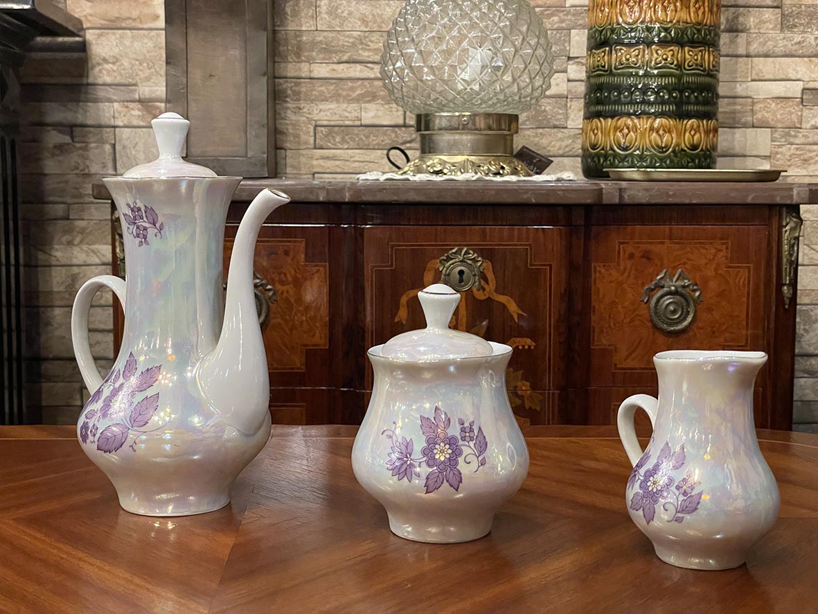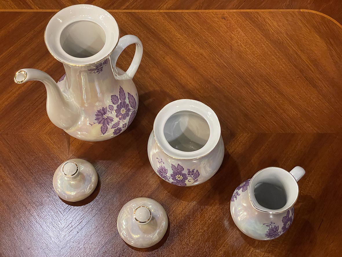 這組來自德國的珍珠瓷咖啡壺套組,帶有典雅的 紫色花卉裝飾,並以珍珠光澤釉面呈現出彩虹般的虹彩效果。