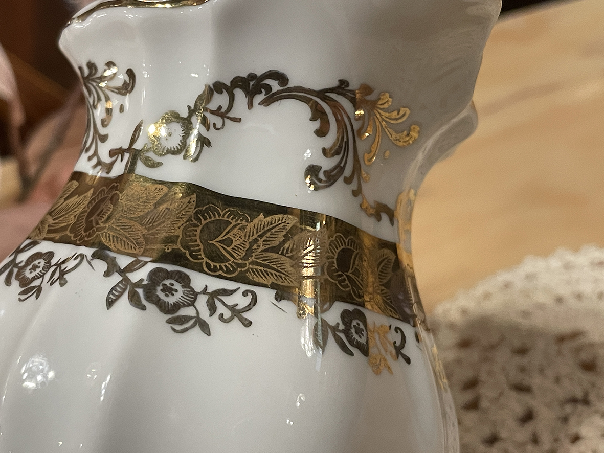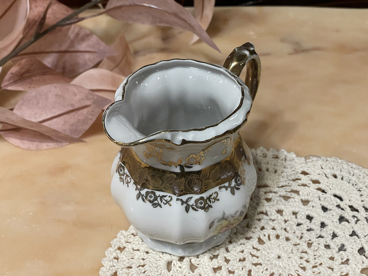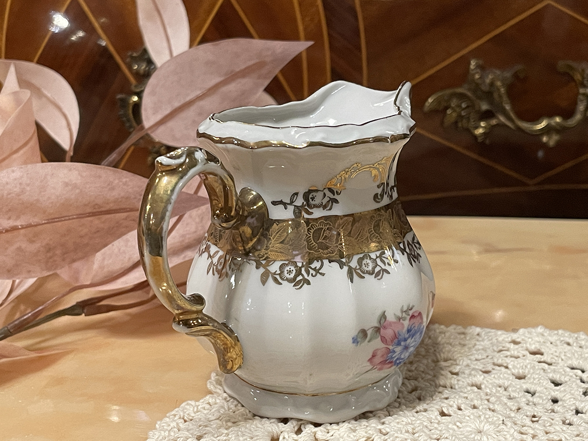 這件來自德國 Barendsen Bavaria 的手繪古董奶壺,約製於 1940 年代初期,展現了巴伐利亞瓷器特有的優雅比例與細膩描金。壺身以柔和白瓷為底,飾以花卉手繪與 24K 金彩藤蔓與浮雕金邊,搭配波浪形口緣與弧線手把,造型溫潤圓潤卻極具古典層次。