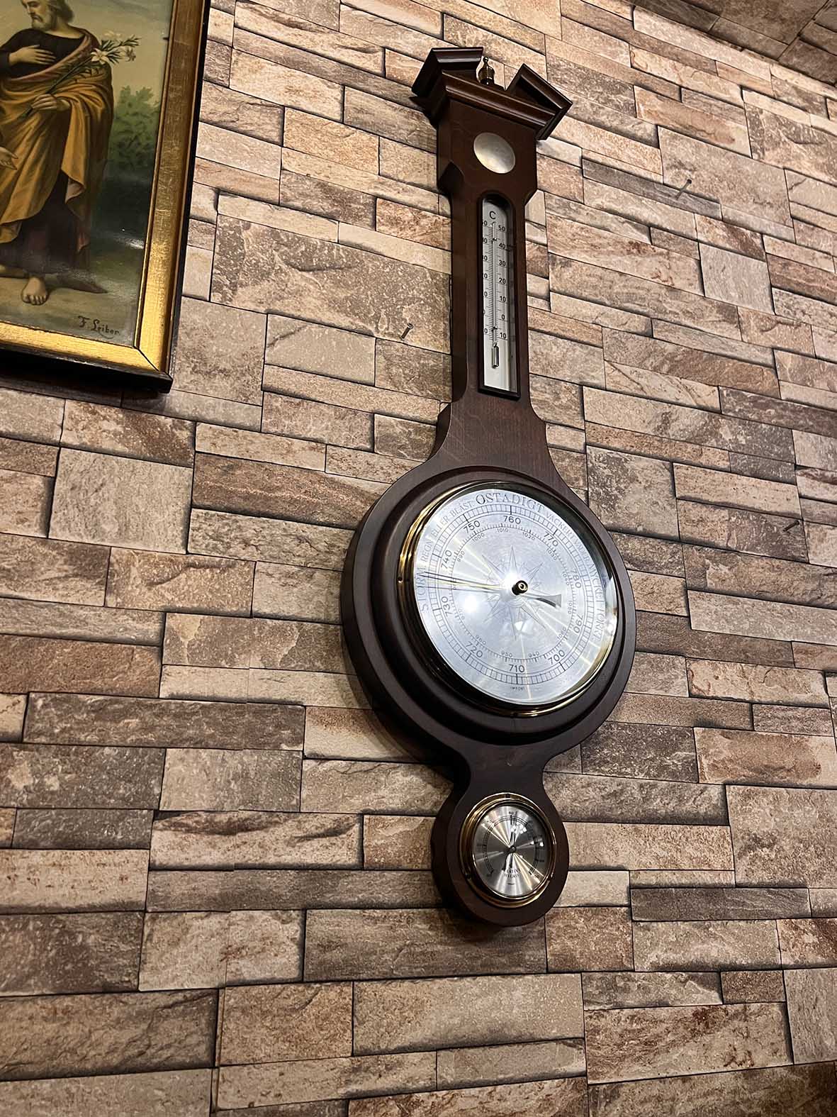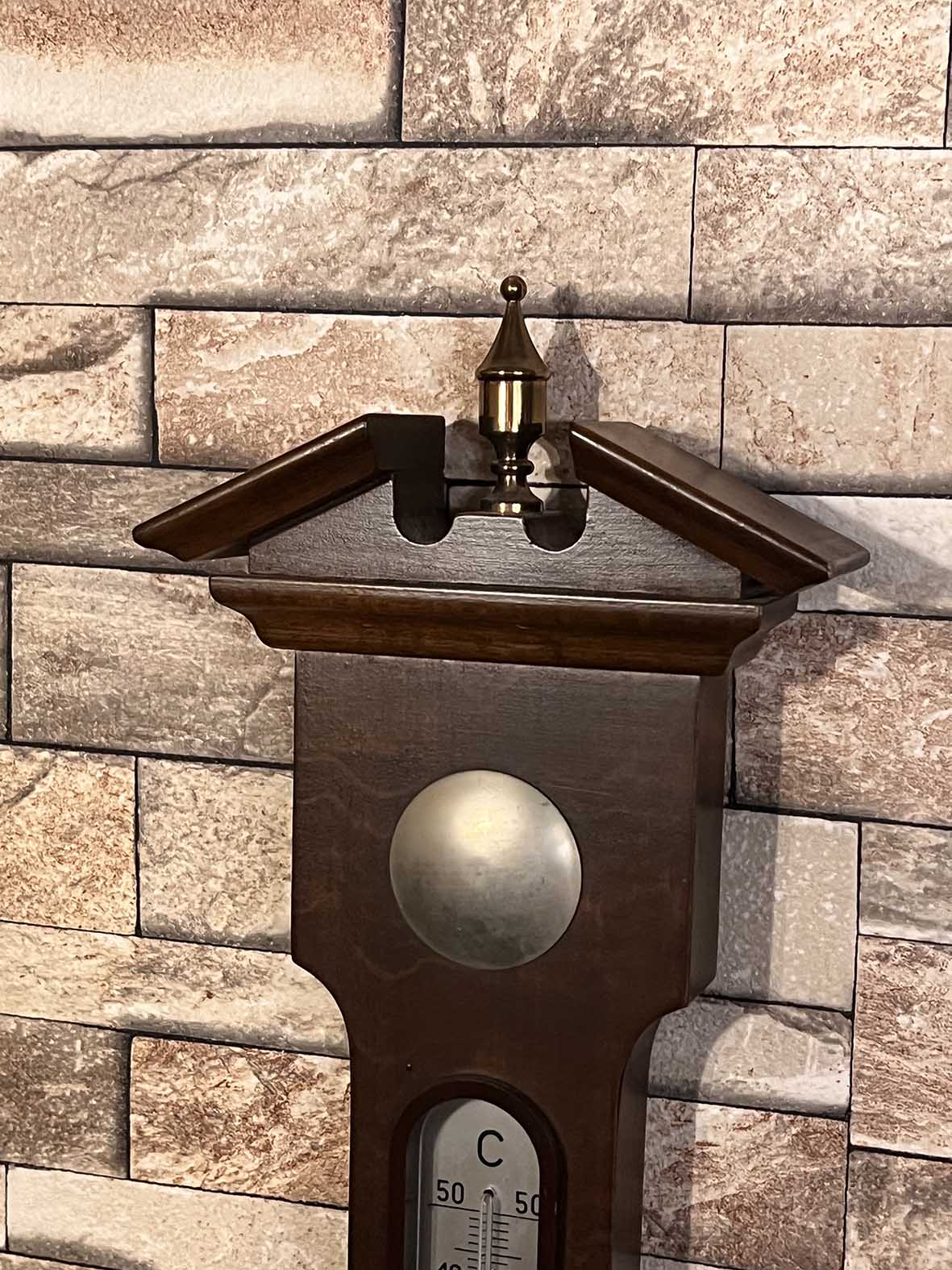 這件來自北歐瑞典的大型晴雨錶,以質感溫潤的實木框架製作,搭配典雅的古典屋簷造型頂飾與黃銅裝飾件,整體外觀沉穩大器,極具存在感。