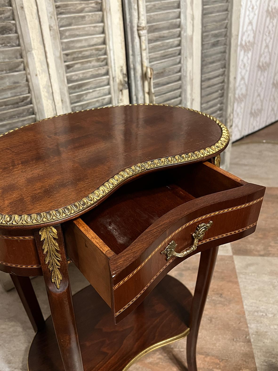 #FrenchAntique #NeoclassicalTable #LouisXVIStyle #MahoganyFurniture #CurvedDrawer #ClassicDesk #OrnateHardware #ElegantFurniture #AntiqueSideTable #InteriorCharm