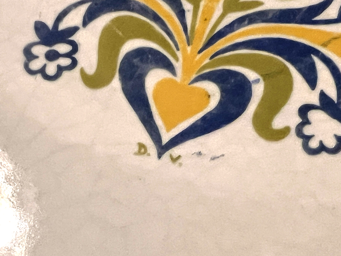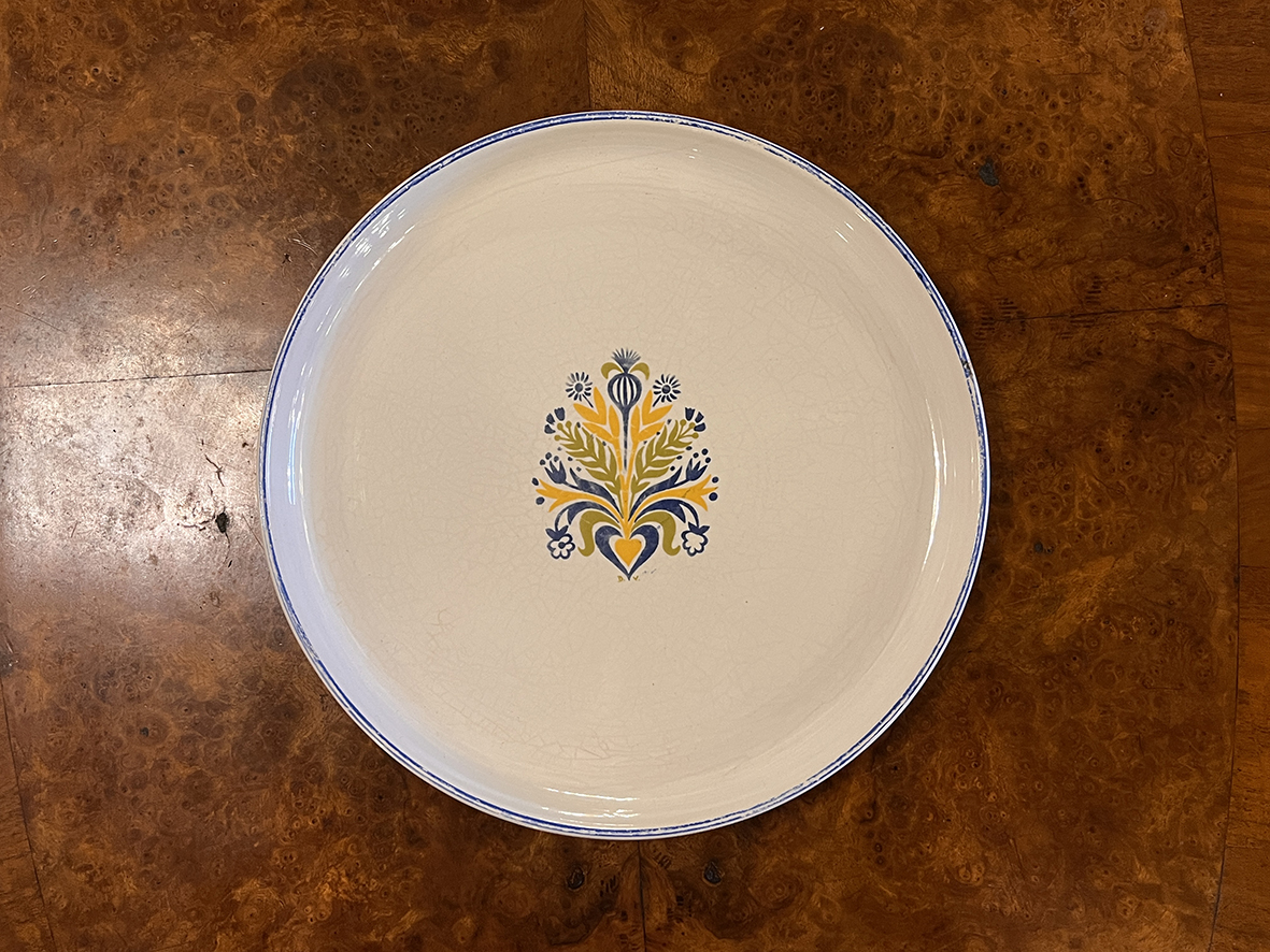 這只法國古董厚陶盤以簡約而溫潤的造型呈現,盤面中央手工繪製的藍黃花卉,筆觸帶有明顯的自然風格與自然筆勢,源自十九世紀末,展現出當地陶工以生活為本的藝術表現。