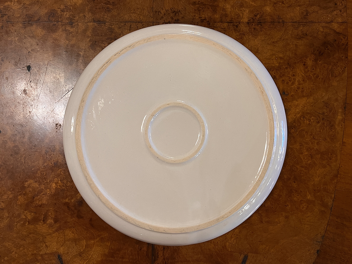陶盤以厚實胎土手工成形,外緣以藍色手繪線條收邊,表面覆以透明釉,歲月下產生自然的冰裂紋紋理,更添老件韻味。底部未施釉環圈露胎,顯見傳統窯燒工法。