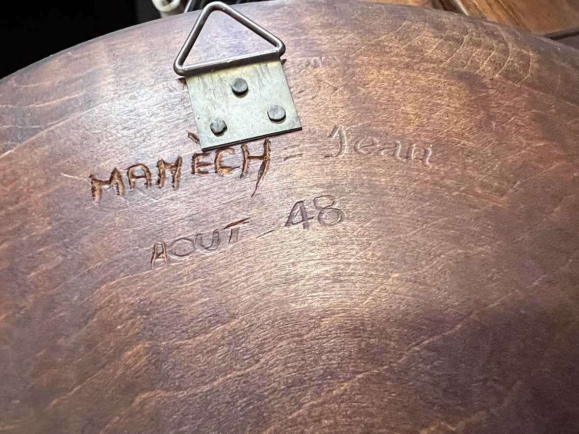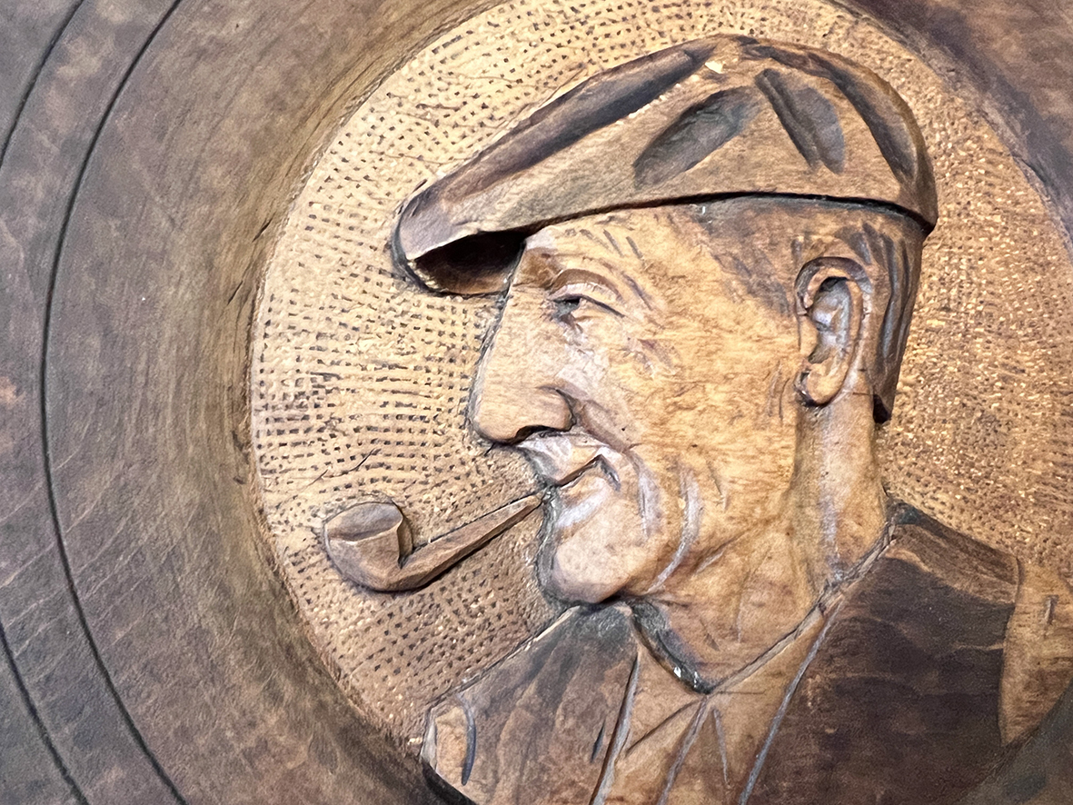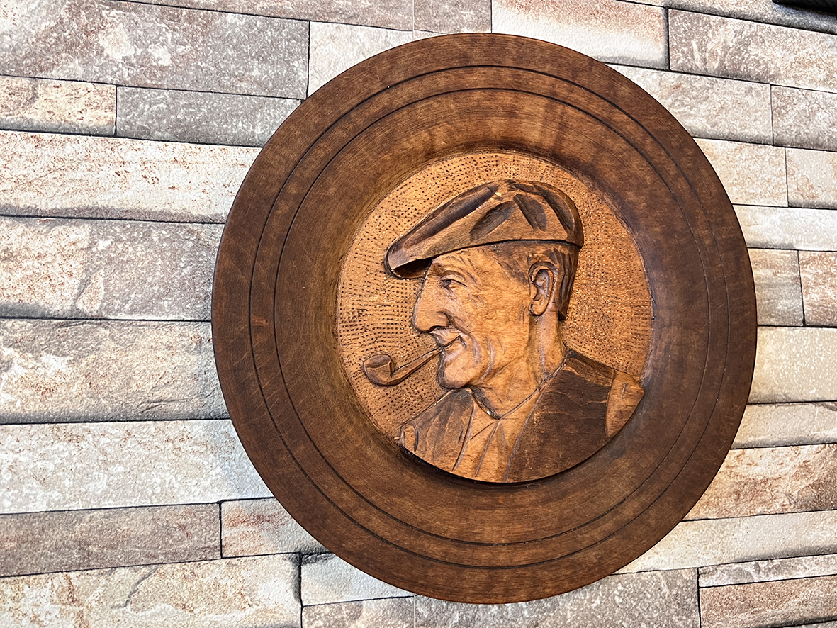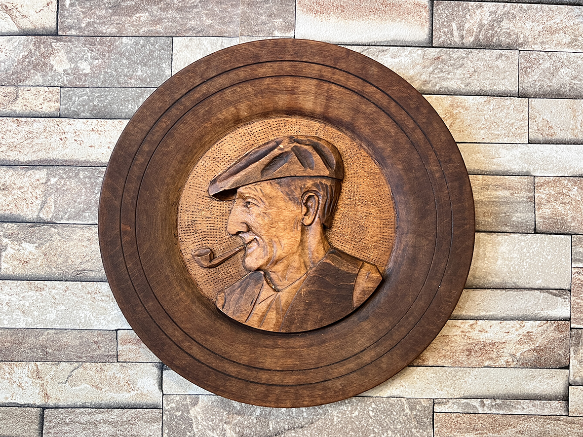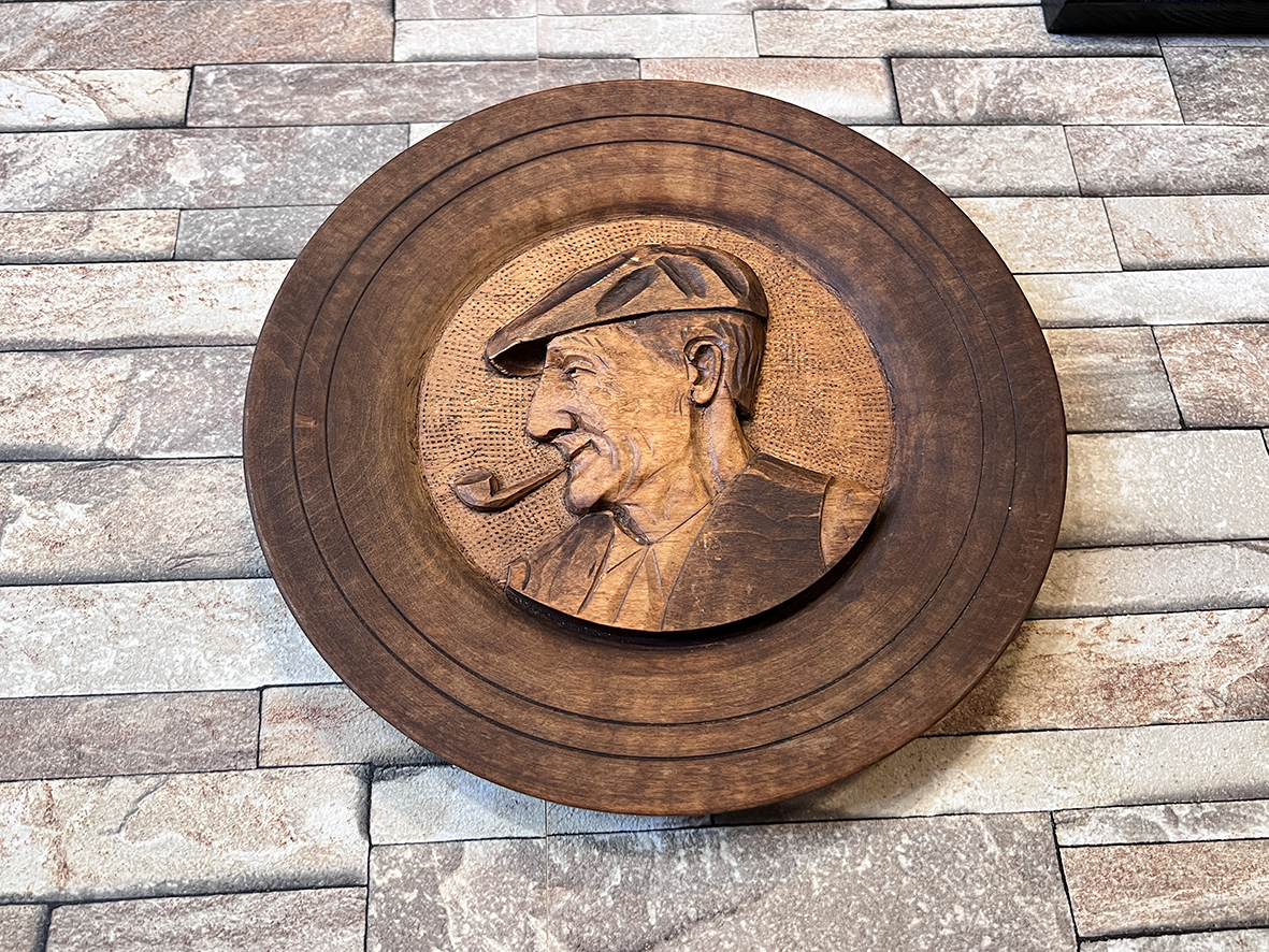 這件法國木雕掛盤以直徑 24 公分的整塊橡木精細雕刻,描繪一位嘴叼煙斗、頭戴報童帽的老爺爺形象。