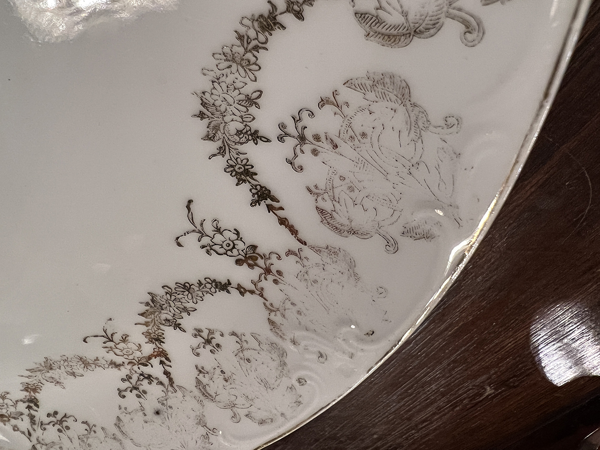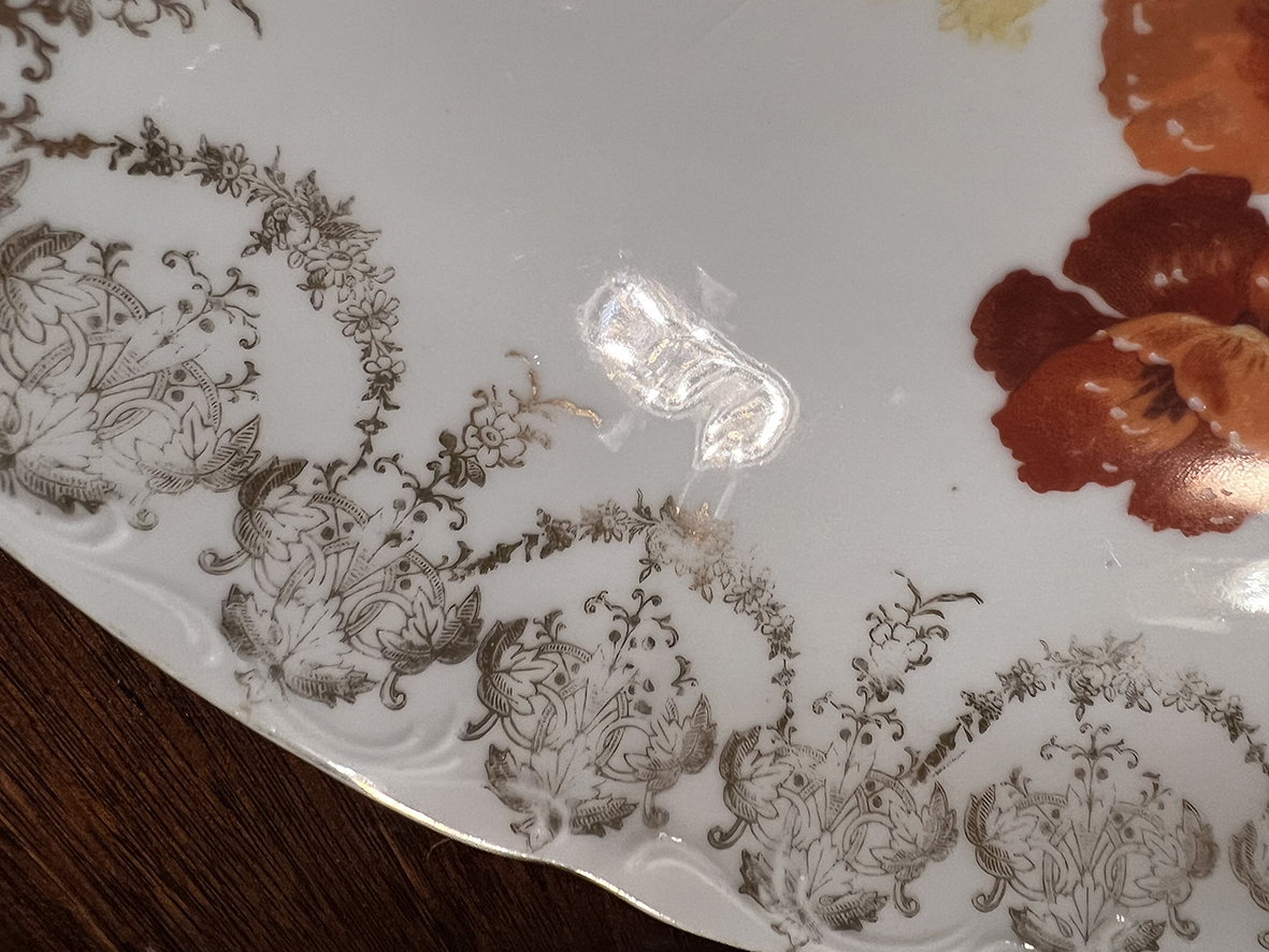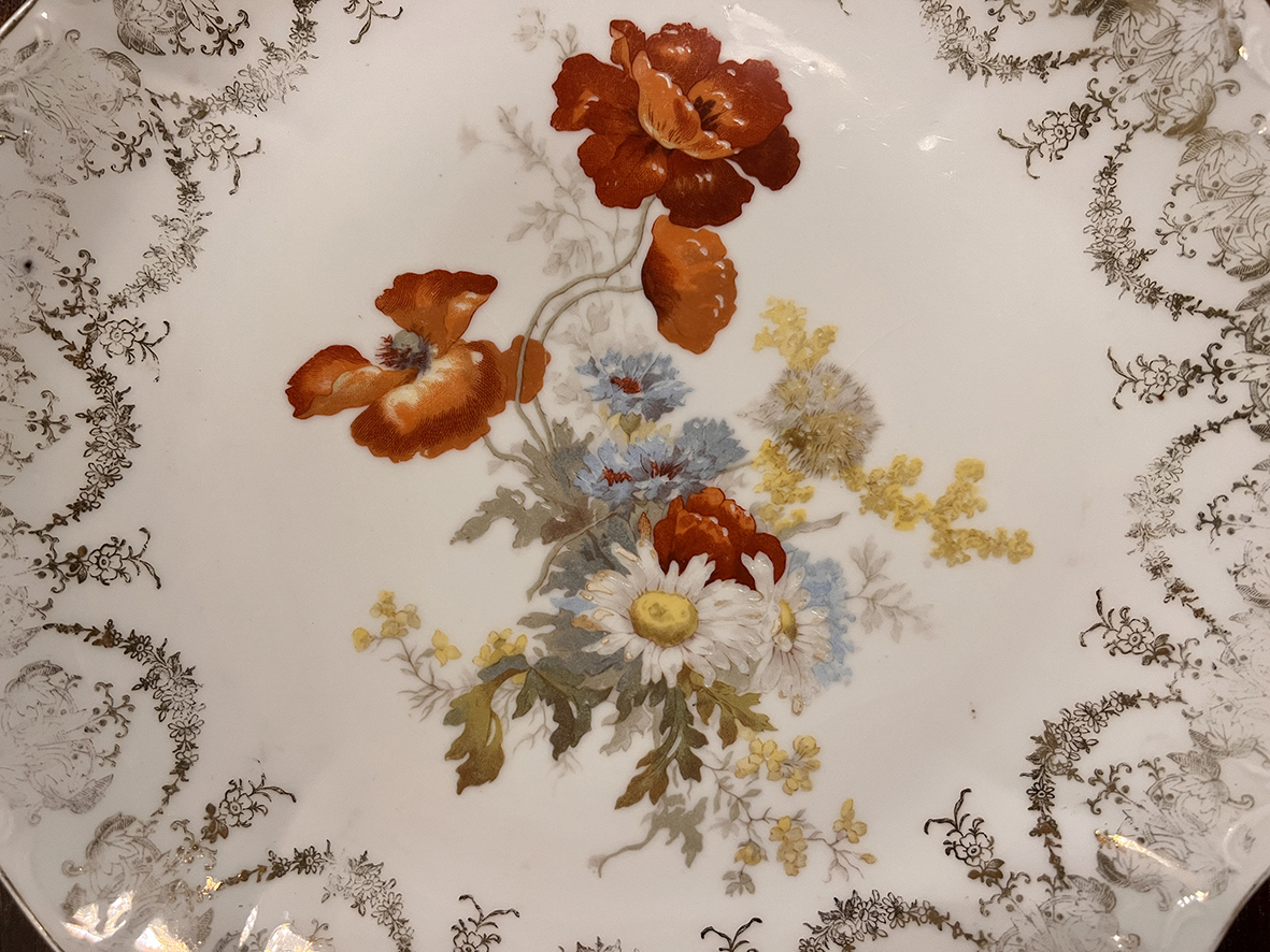 這件法國出產的古董收藏盤,直徑達 31 cm,屬於大尺寸展示盤。盤面以紅色罌粟、藍色雛菊與白色小花組成花卉束,色彩鮮明而富有層次,周圍飾有精緻的金彩花紋,邊緣還帶有浮雕細節,展現了 19 世紀末至 20 世紀初法國瓷器裝飾的典雅風格。