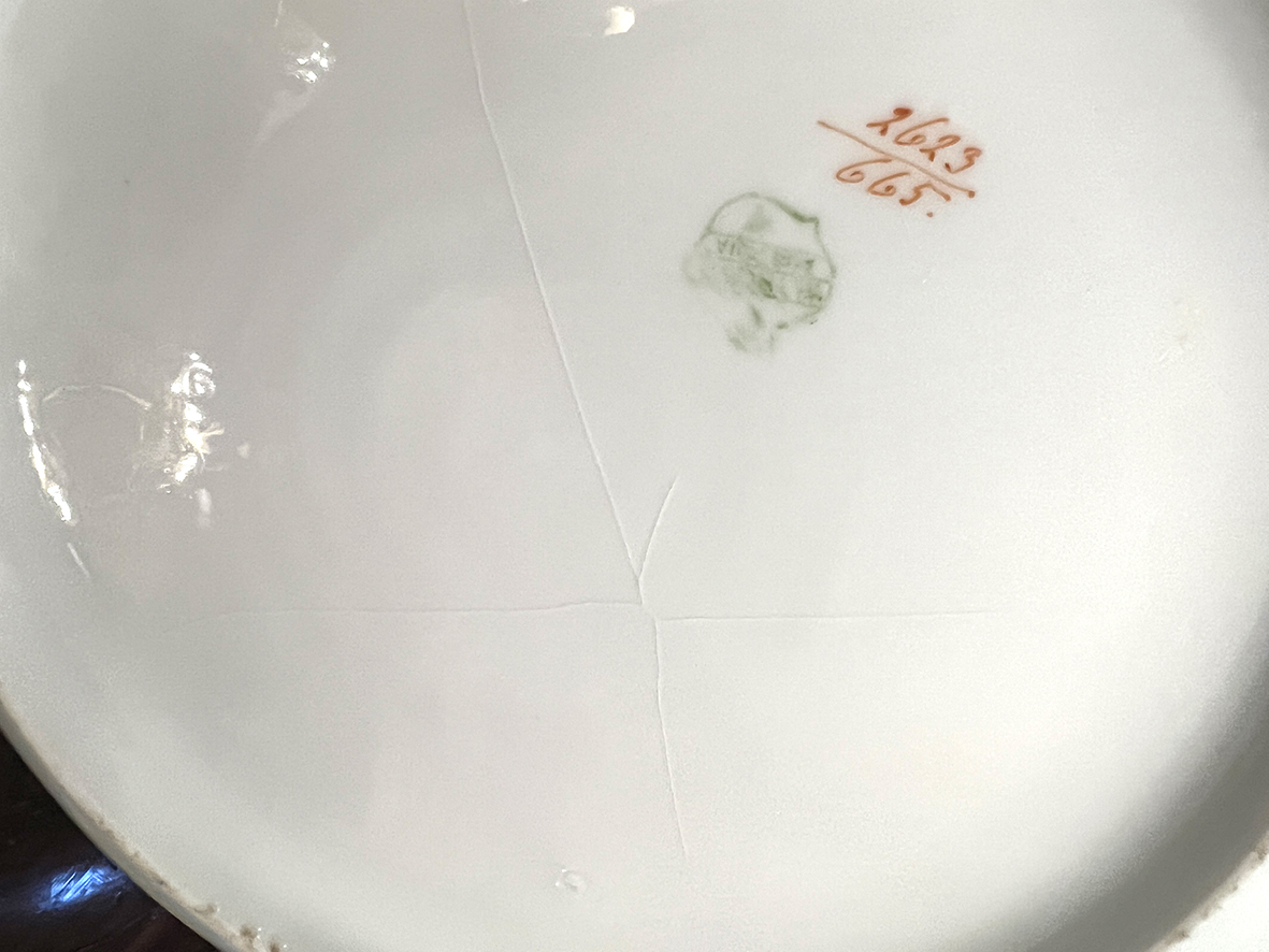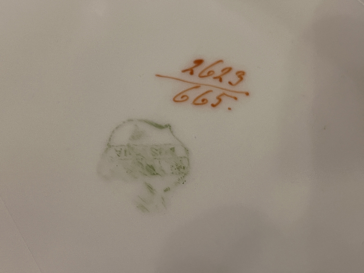 背面可見綠色窯印與紅色手繪款號(2623/665),該窯印屬於 Limoges Coiffe 工廠使用的典型綠色標記,約落在 1891–1914 年期間。這段時間正值利摩日瓷器的黃金時期,以精緻的白瓷與手工裝飾聞名於世。