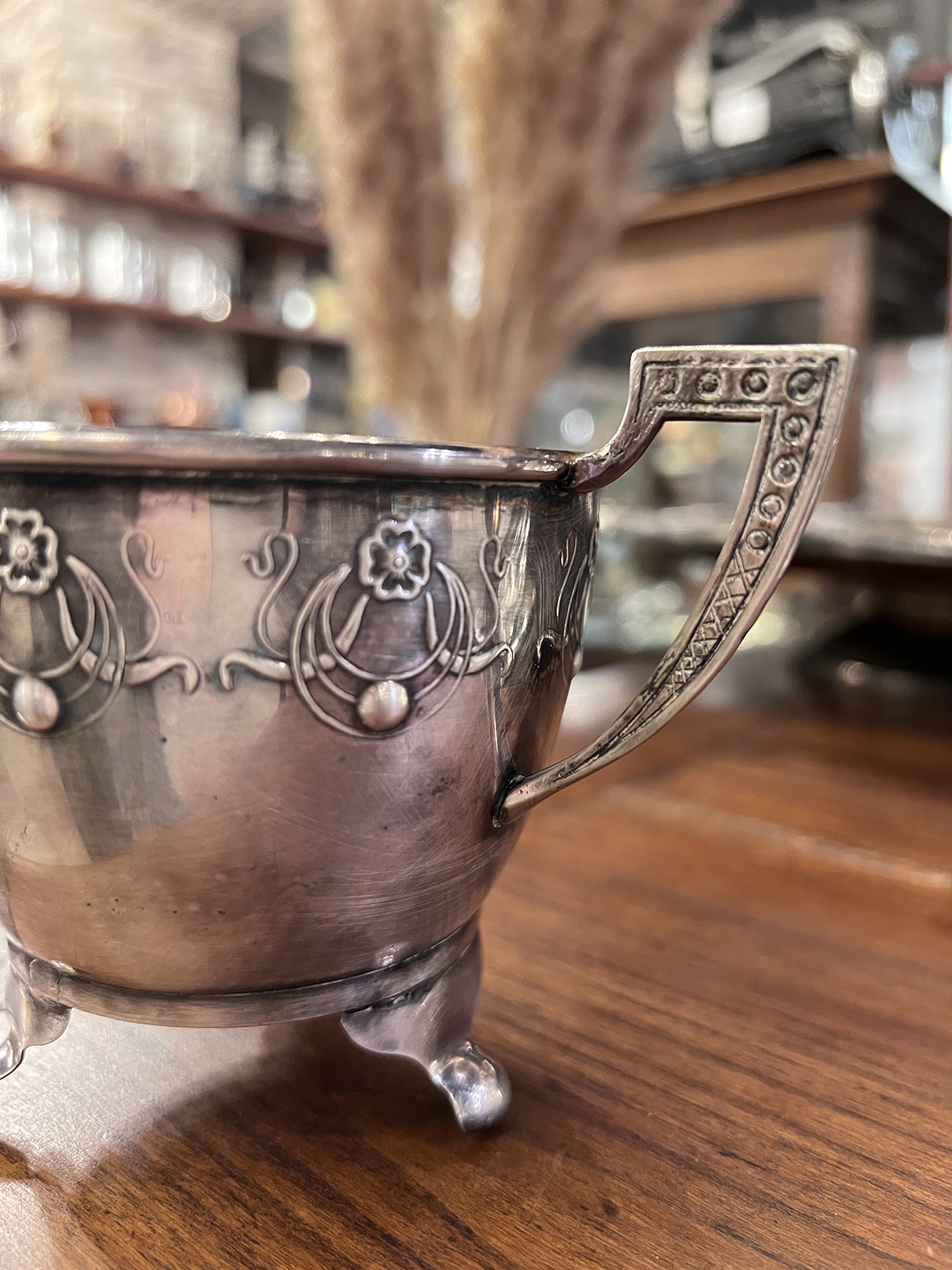 這件來自丹麥的古董鍍銀雙耳罐,設計小巧卻極具工藝美感。罐身以新藝術風格的花卉浮雕裝飾,線條流暢而細膩,搭配對稱雙耳設計,使整體比例優雅均衡。底部為三足獸爪立座,帶來穩固性與古典氣息。