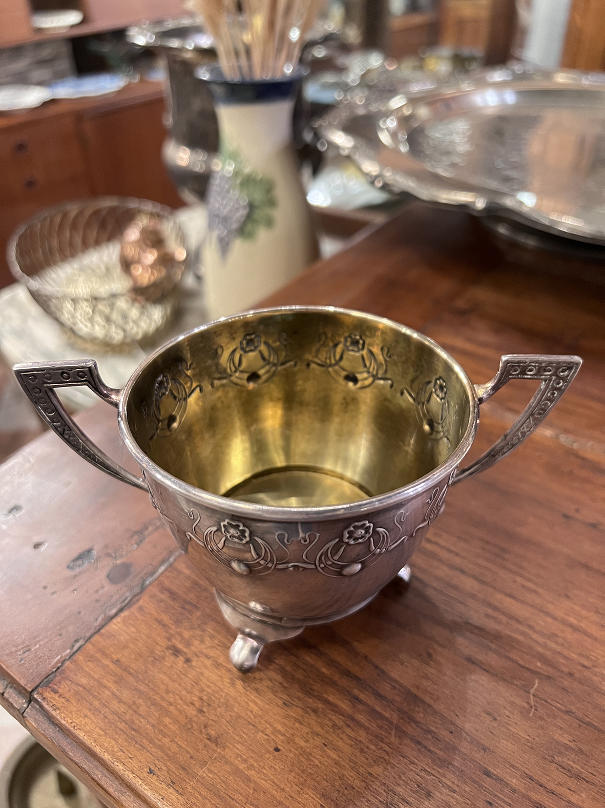 #丹麥古董 #鍍銀雙耳罐 #銀器收藏 #新藝術風格 #北歐古董 #茶席器物 #古典餐具 #浮雕工藝 #AntiqueSilver #VintageSilver
