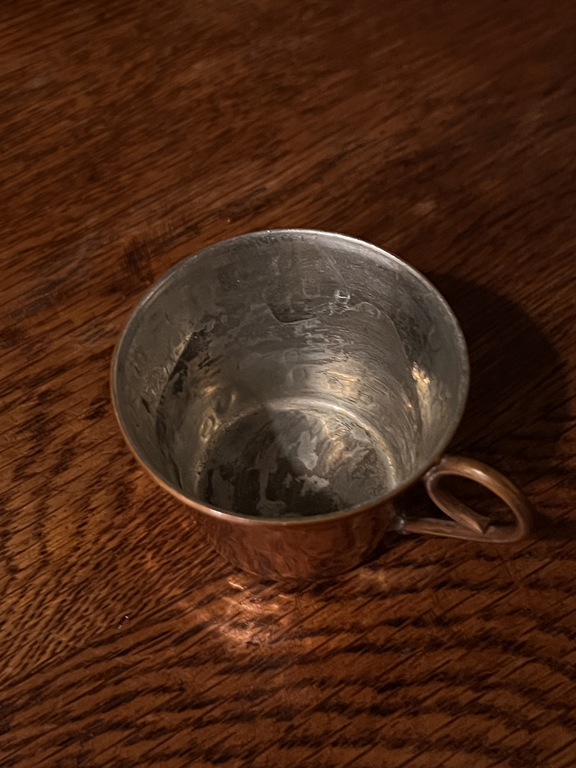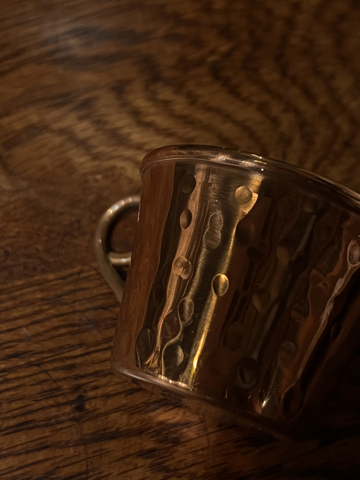 這件來自法國的古董紅銅小杯,以手工鎚打製成,外層紅銅色澤溫潤帶有自然光澤,內層則以厚錫塗層處理,兼具實用與防氧化功能。杯身呈現細緻不規則的槌紋反光,每個角度都能映照出職人手工敲製的節奏感。