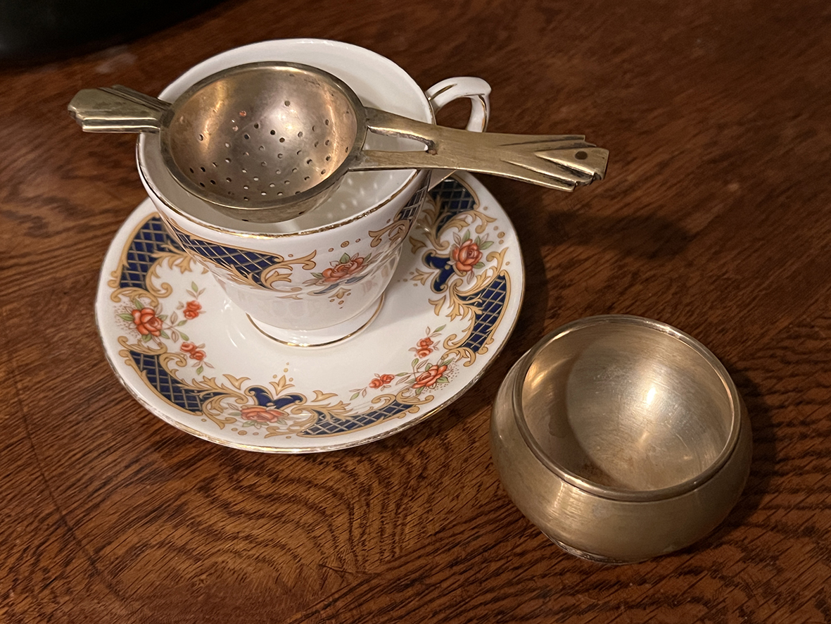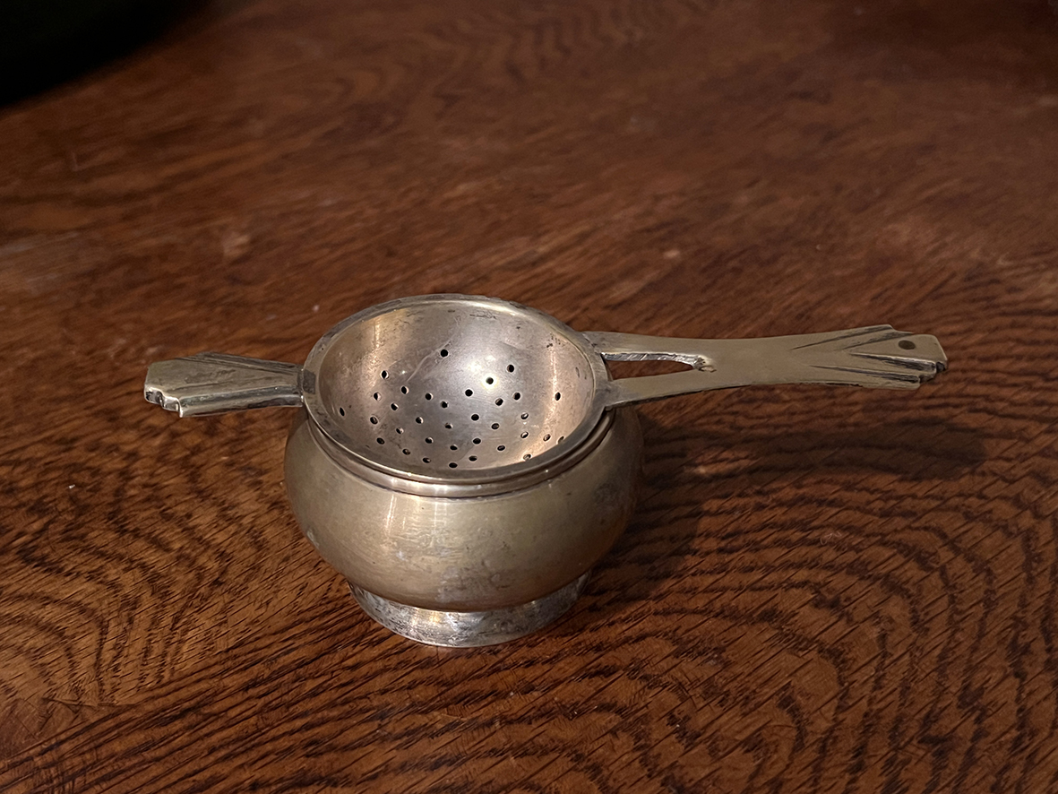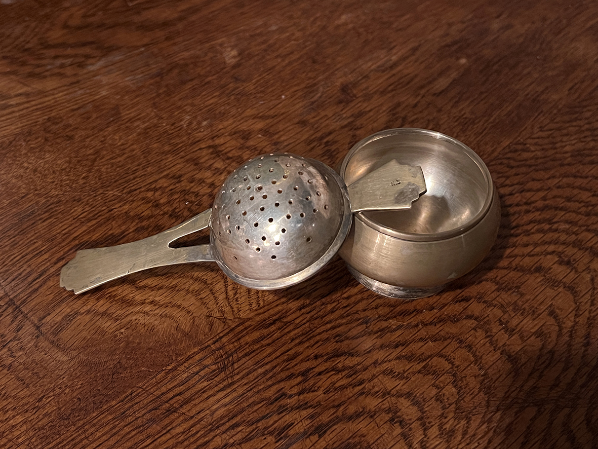 茶濾匙以鍍銀材質製成,表面刻印「NS」字樣,代表 Nickel Silver(鎳銀合金),再覆以銀層,增添光澤與耐用性。其設計為「濾網+承杯」的完整組合,使用時將濾匙置於茶杯上即可過濾茶葉,搭配承杯收納茶湯,兼具功能與典雅風格。