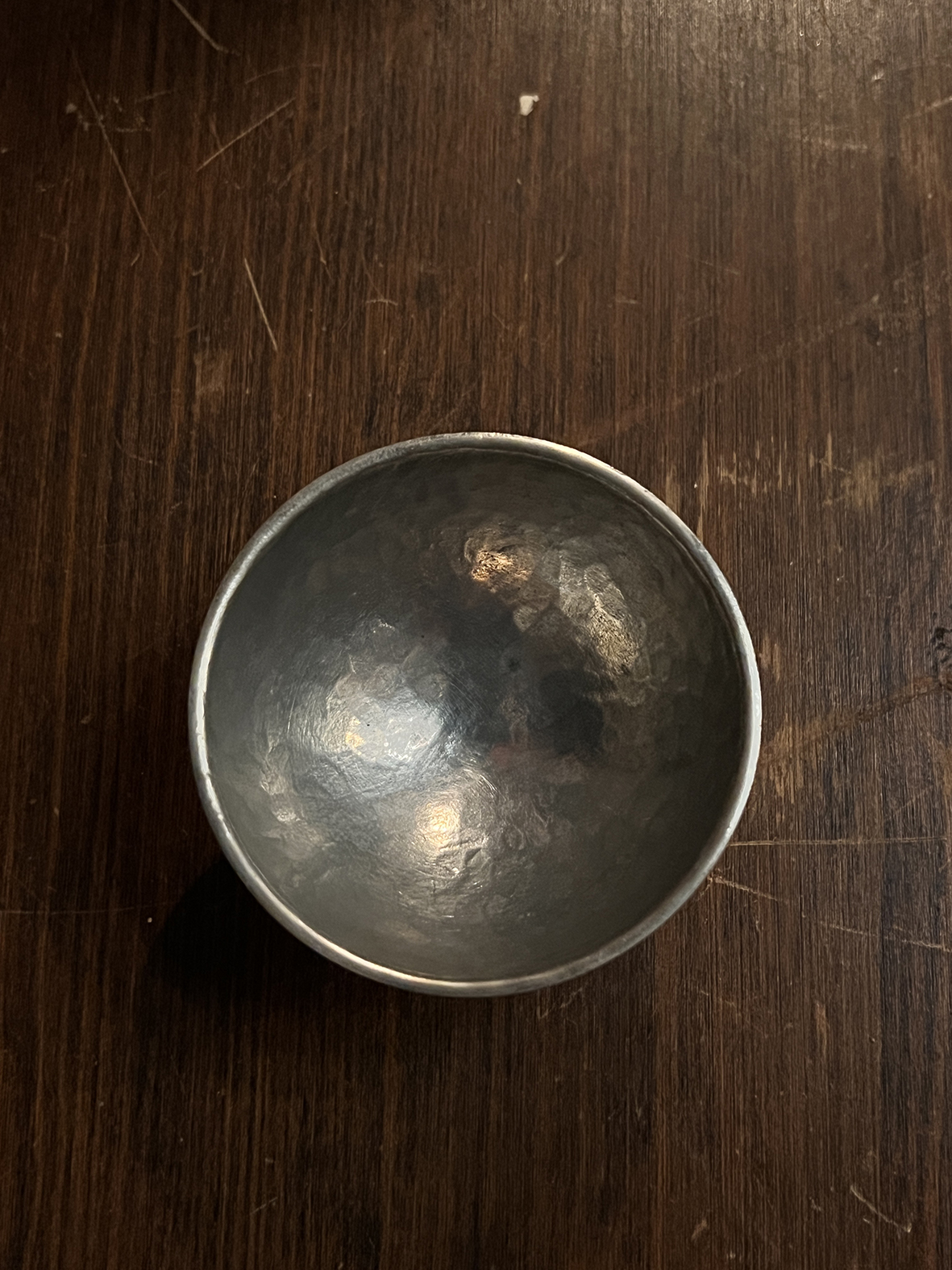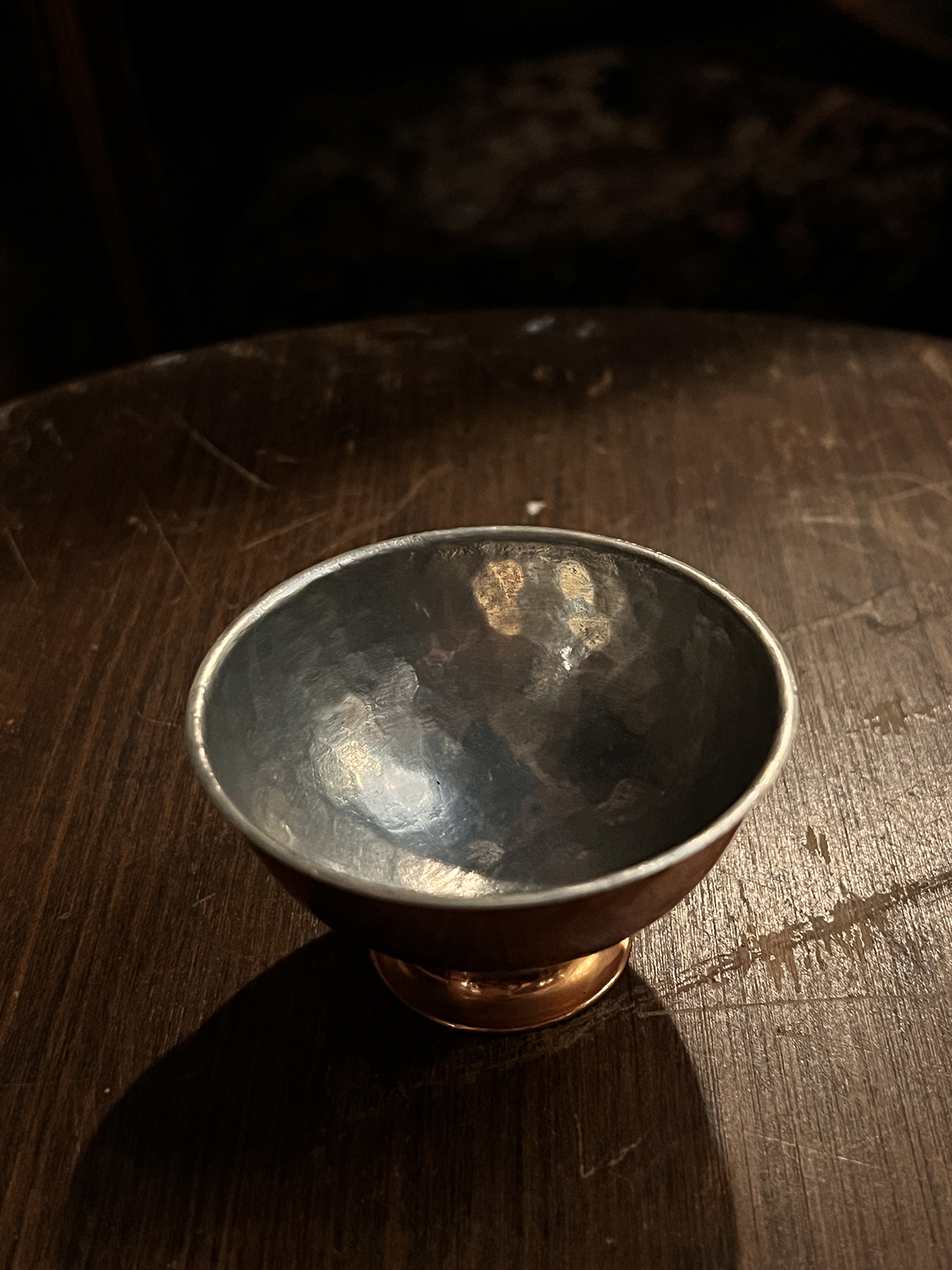 這件來自法國的紅銅小酒杯,以傳統手工敲擊成形,杯身帶有細緻的手敲紋理、光澤溫潤迷人。內層完整鍍錫,可正常使用盛裝烈酒、利口酒或作為品酒小杯。
