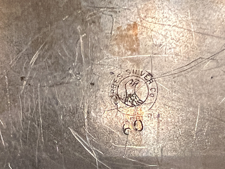 此類長型鍍銀盤原用於銀器文化中的麵包屑鏟盤、餐桌托盤或飾品盤,今日可用於擺放首飾、香氛、鑰匙或甜點,增添歐陸與美式古董氛圍。底部可見 「FORBES SILVER CO.」 鷹圖商標印記,為百年老件真跡。