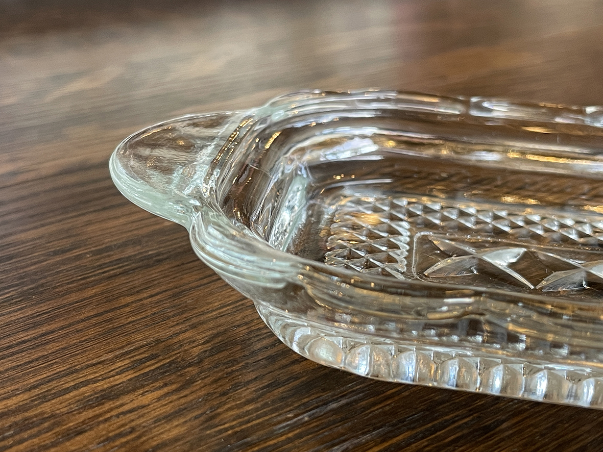 這件法國手工水晶奶油盤,呈長方形搭配兩側小耳設計,邊緣帶有柔和的弧形波紋。盤底以手工刻花工藝雕琢出六枚立體四瓣花圖案,周圍圍繞細緻的菱格紋,透光後呈現優雅的折射效果。此類作品多見於19世紀末至20世紀初的歐洲餐桌器物,常用於盛放奶油、麵包或小點心。