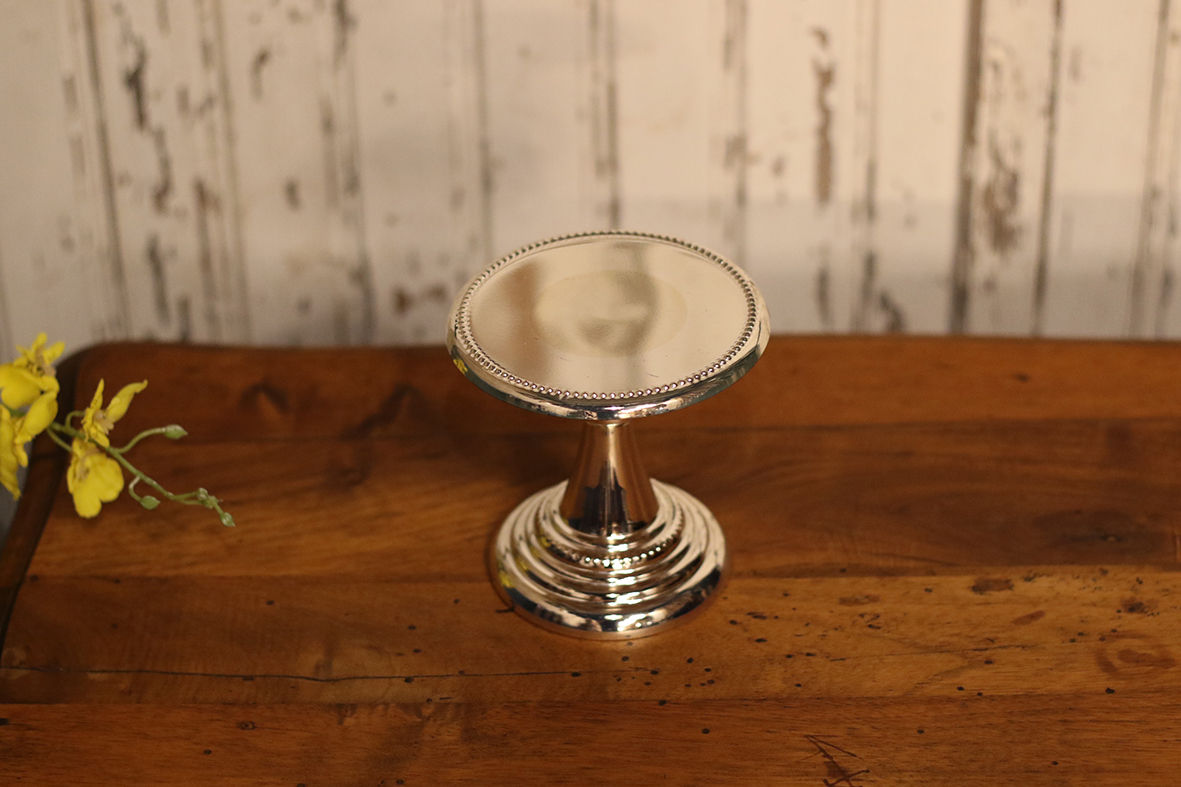 這件來自英國的 鍍銀高腳展示檯,鏡面檯面邊緣飾有細緻珠點裝飾,整體線條層次分明,展現出古典優雅的英式工藝美感。