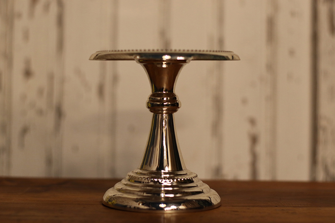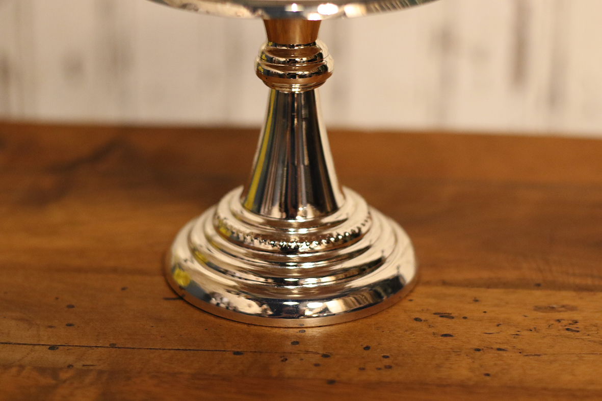 高腳設計使物件更具立體感,無論展示珠寶、鐘錶、瓷偶或迷你收藏品,都能突顯焦點。鍍銀表面光亮而典雅,隨著光影變化散發出細膩的金屬質感。