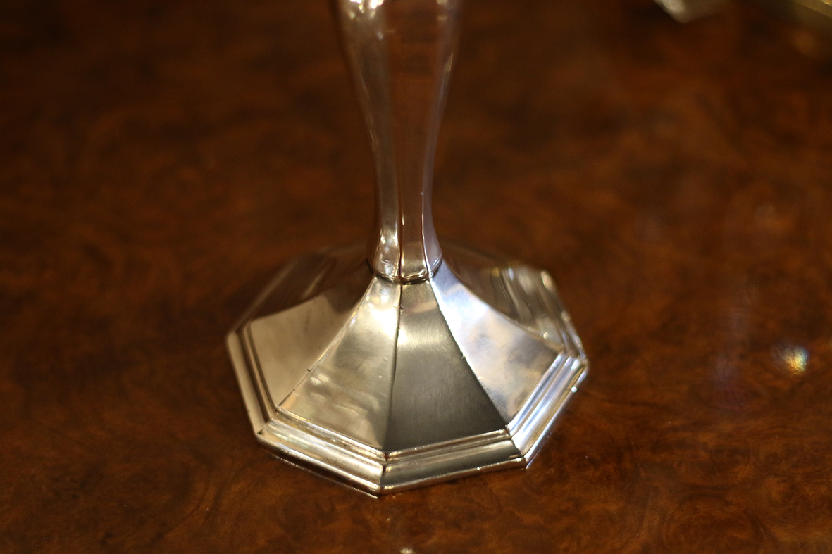 燭台造型挺拔優雅,主體線條由燭座至底部逐漸收放,呈現出流暢的八角面切割感,底座則為寬穩的八角台座設計,既能支撐重量,又增添古典氣質。