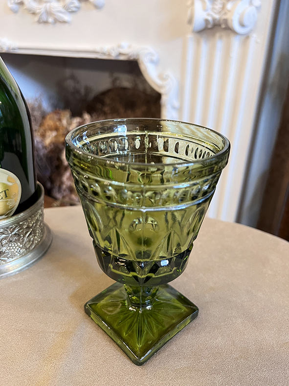 這組高腳杯來自荷蘭,以翡翠綠色厚玻璃製成,杯身飾以立體幾何浮雕紋樣,包含菱形切割、星形放射與圓點飾帶,呈現20世紀中期歐洲玻璃器皿的典型裝飾風格。