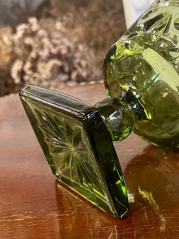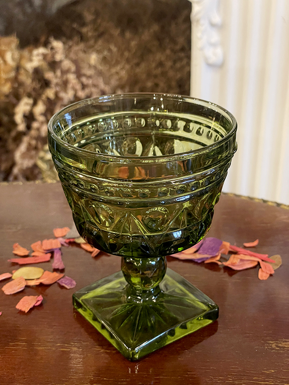 這組高腳杯來自荷蘭,以翡翠綠色厚玻璃製成,杯身帶有立體幾何浮雕與圓珠紋飾,展現20世紀中期歐洲玻璃工藝的華美細節。