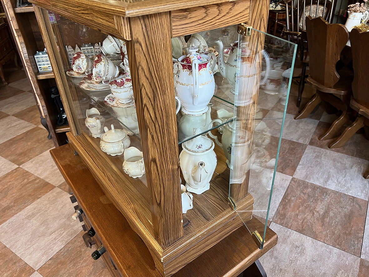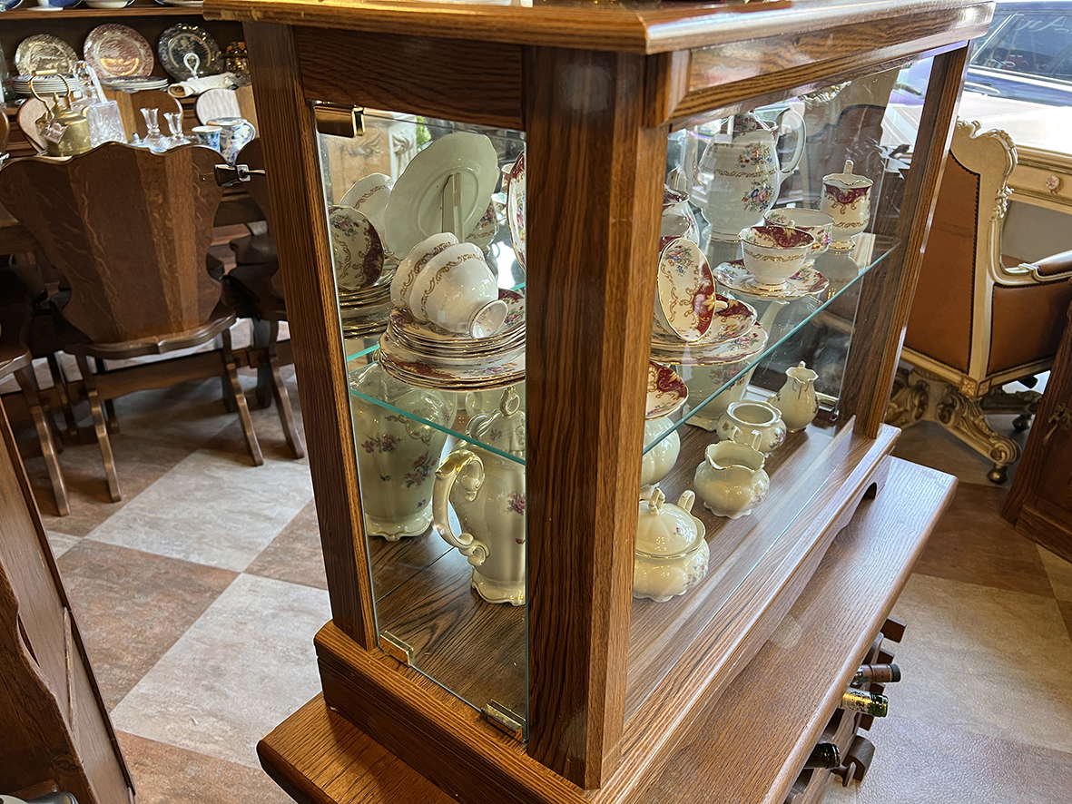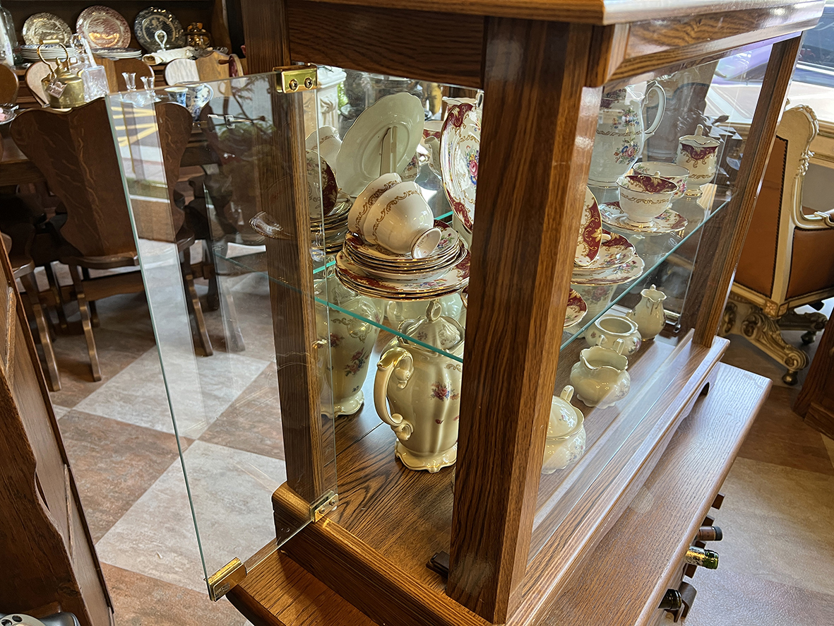 此款展示櫃的側門採金屬鉸鏈玻璃門設計,方便取放且維持整體視覺通透。下方木腳以古典雕弧線收邊,展現英式家具特有的細節講究與製作工藝。