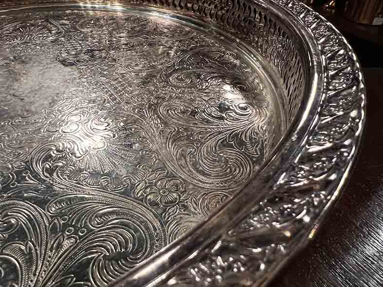托盤表面佈滿細膩的手工花卉與渦卷刻紋,邊緣環繞精緻鏤空設計,不僅提升了透光與層次感,也展現當時銀器工藝的細緻與華美。
