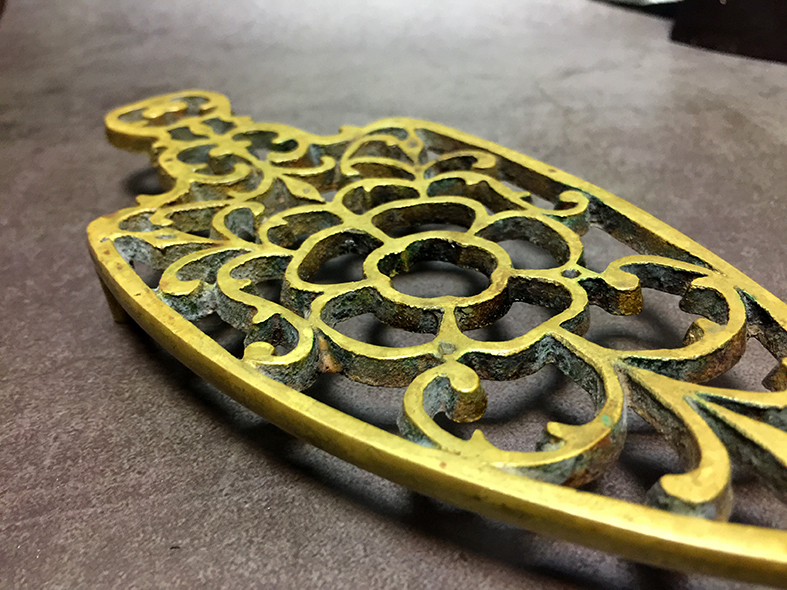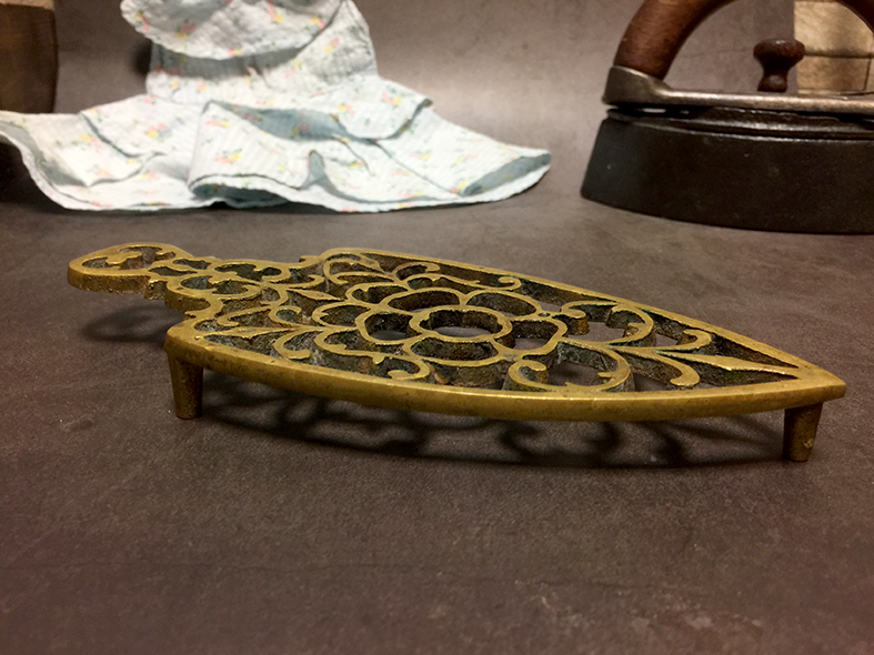這件來自英國的古董手工黃銅熨斗架,呈典雅的鏤空花卉與捲葉紋設計,邊緣線條流暢,細節雕刻精美,展現維多利亞時期對於日常器物的藝術。