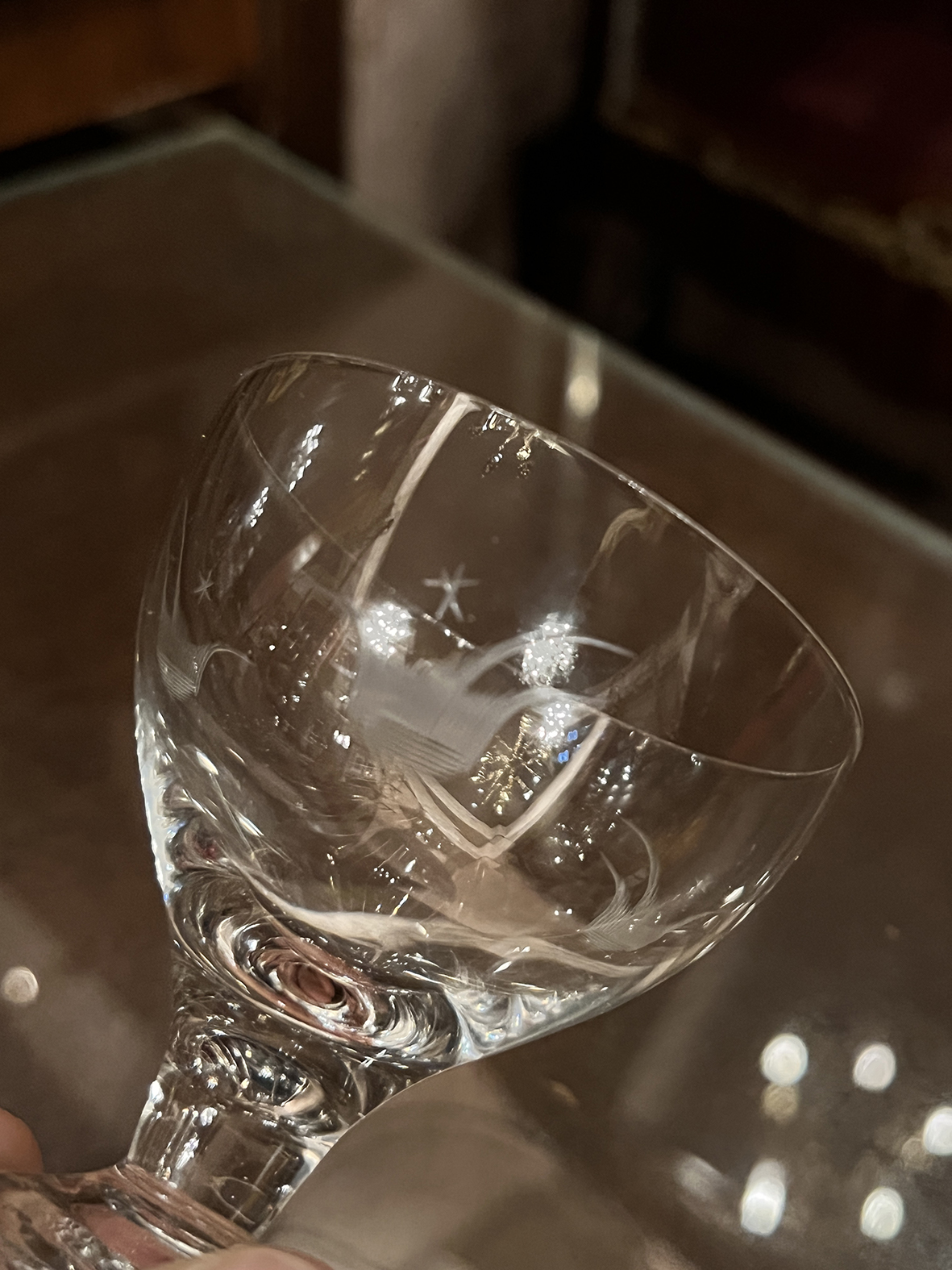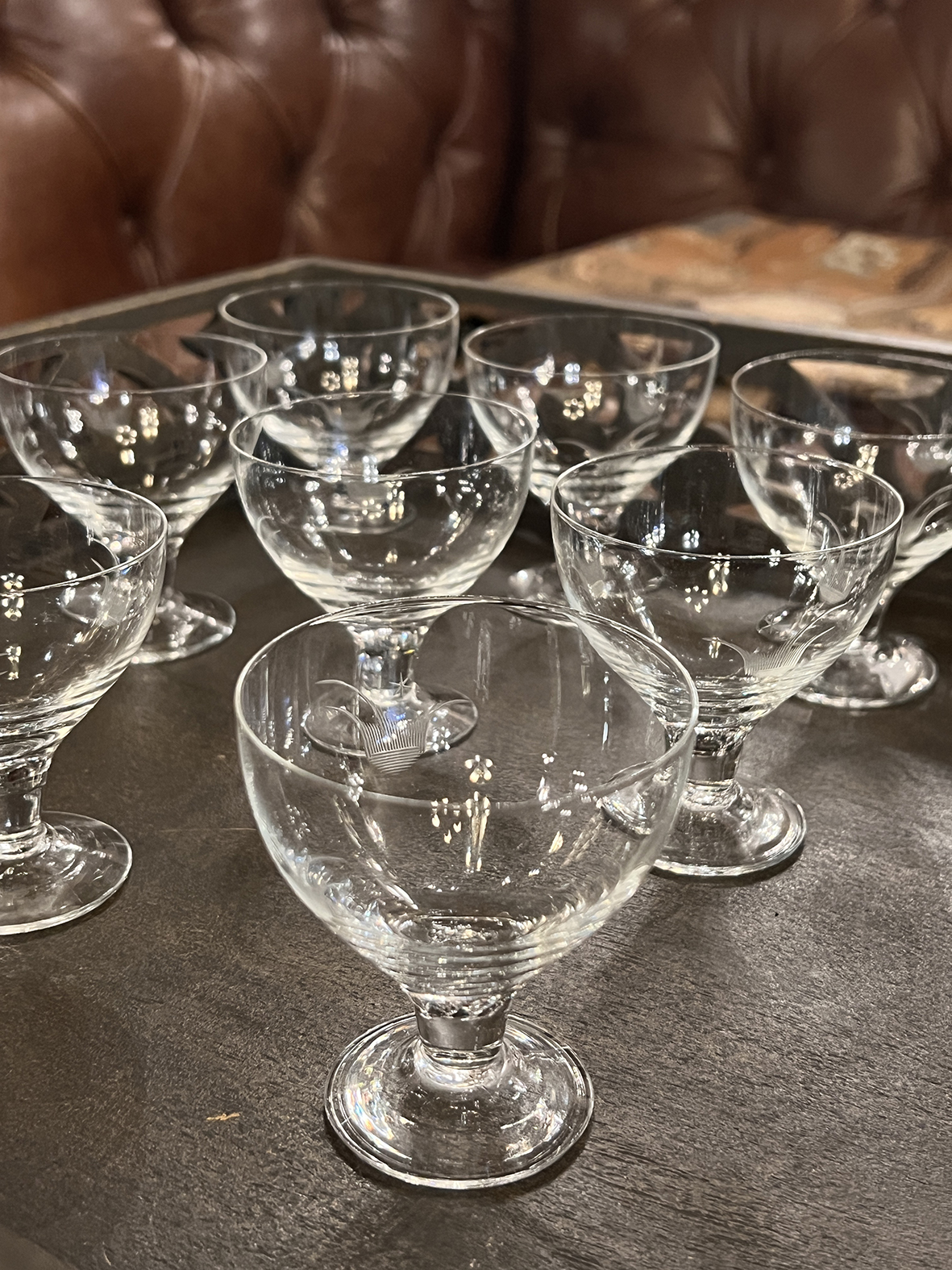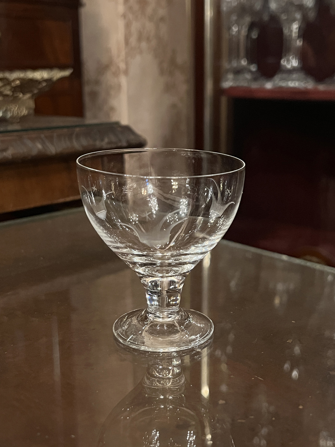 這組來自法國的古董手工蝕刻水晶高腳杯,以纖薄透亮的水晶手工吹製而成,呈現極致的輕盈質感與清脆杯音。杯身以精細的蝕刻工藝刻繪出流動弧線與星花圖案,線條均勻、透明層次分明,展現法式水晶工坊的非凡手藝。