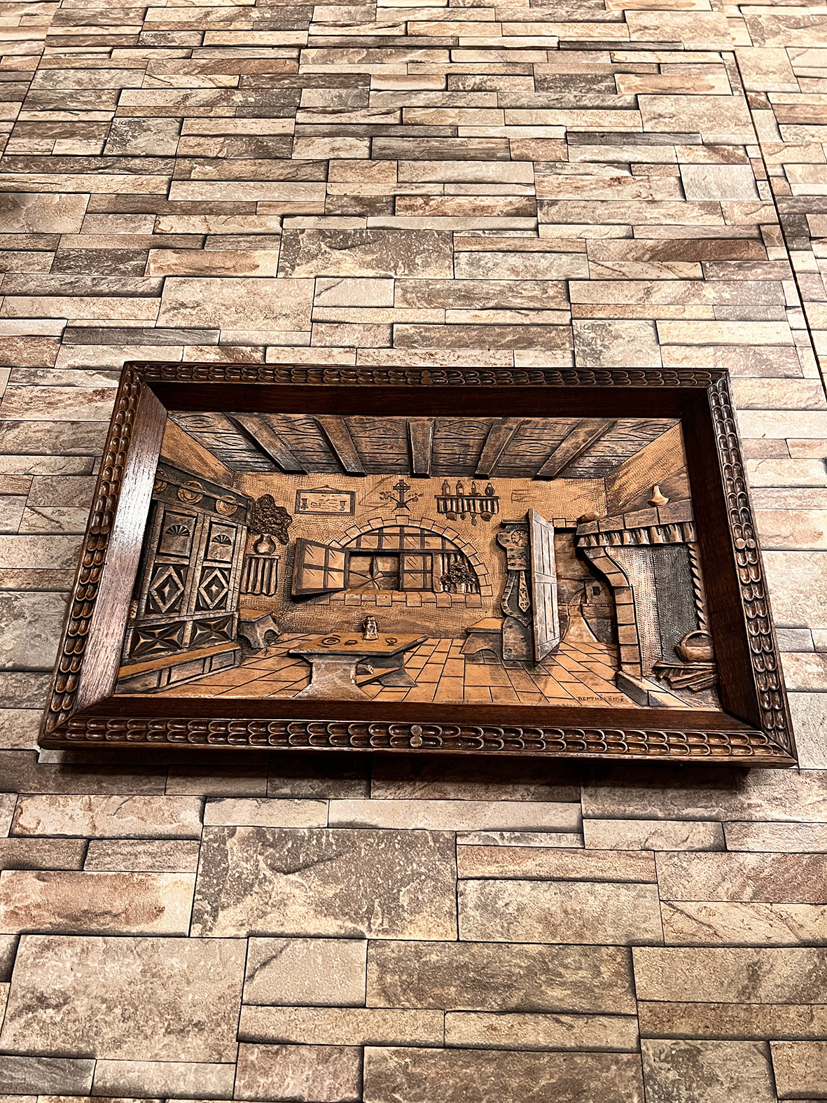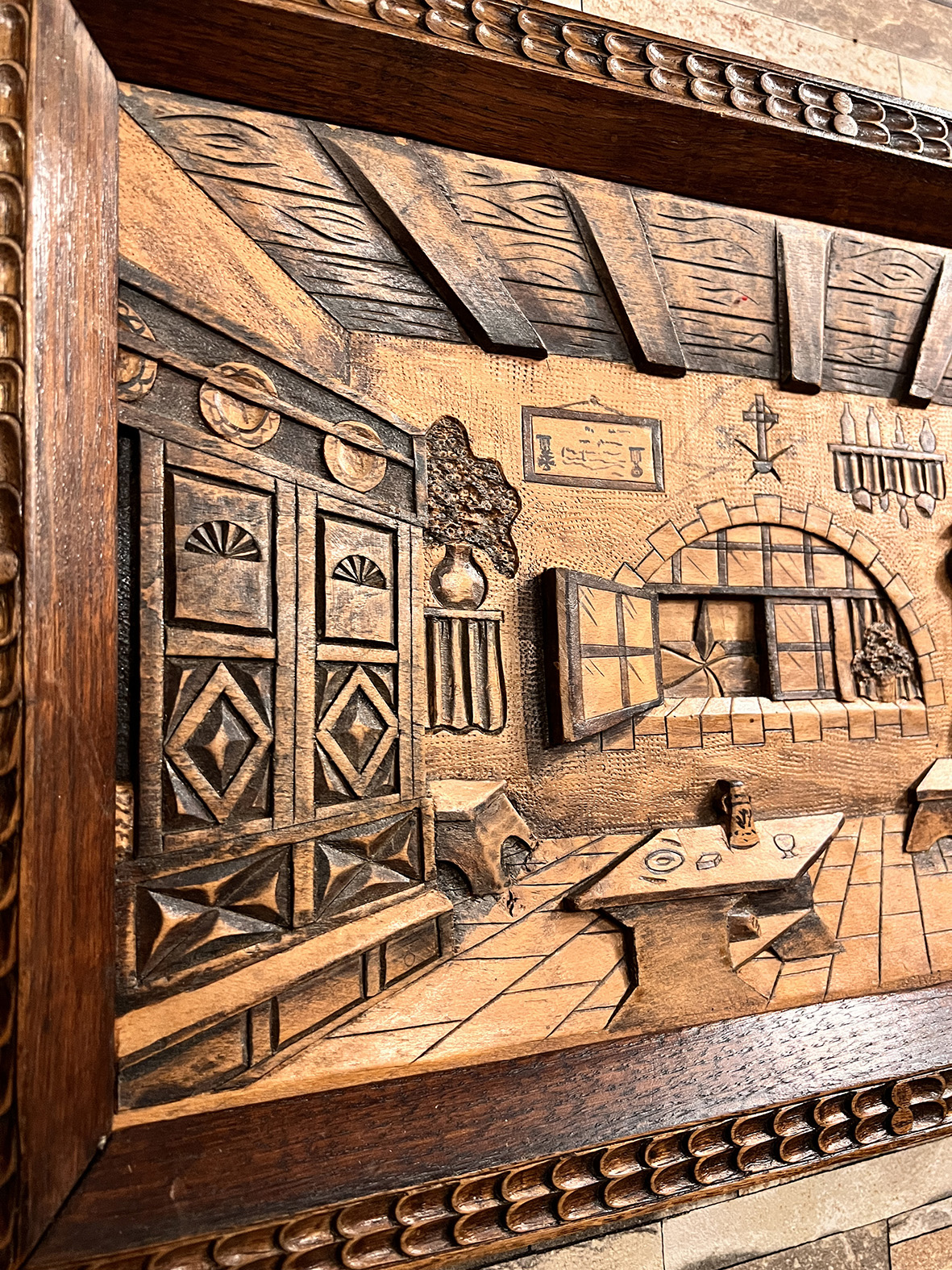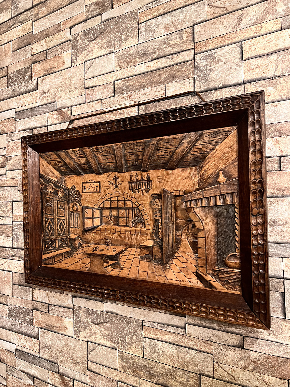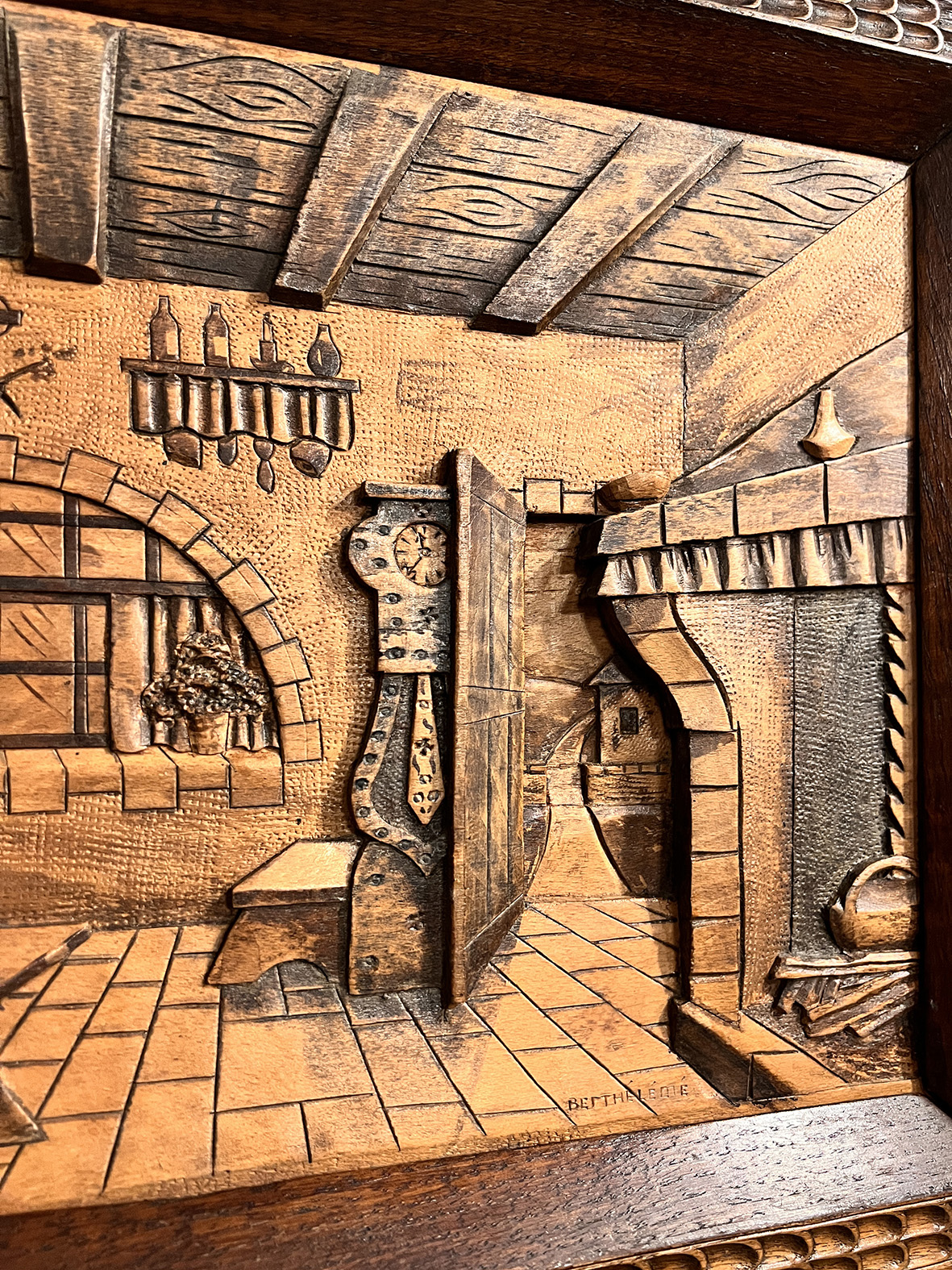 這件來自法國的百年古董立體雕刻畫,以全實木手工雕刻完成,呈現細膩的法式鄉村室內景致:厚重的橡木家具、裸露的木樑天花板、壁爐、長桌與瓶罐細節,甚至窗外景色都一一刻劃,立體層次感極佳。