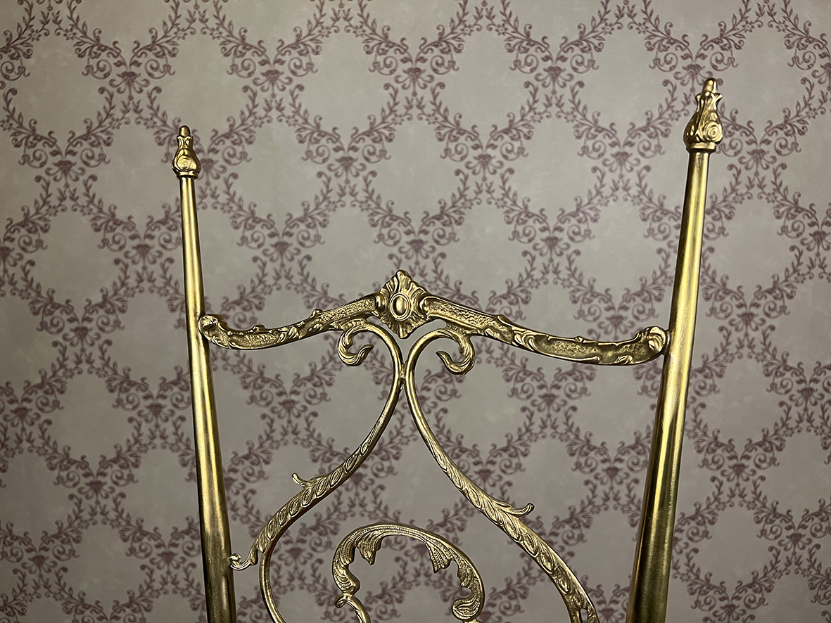 椅背採鏤空雕花設計,黃銅構件以繁複卷草紋、貝殼與洛可可式渦紋組成精緻對稱圖案,頂端飾以蓮花形端飾與兩端尖錐柱帽,整體呈現極具戲劇張力的垂直線條美。椅腳與橫桿之間以精細翻模接合,穩固結構之餘亦強化了視覺上的修長感。