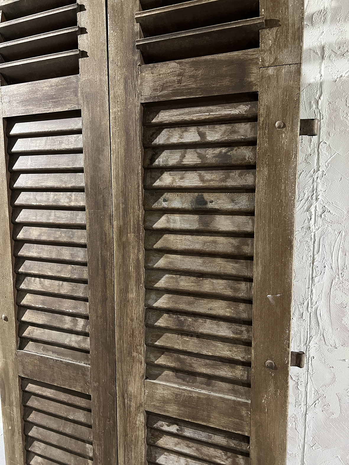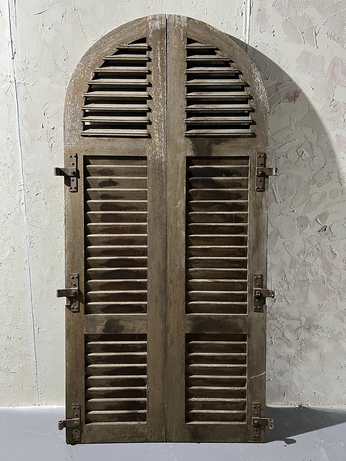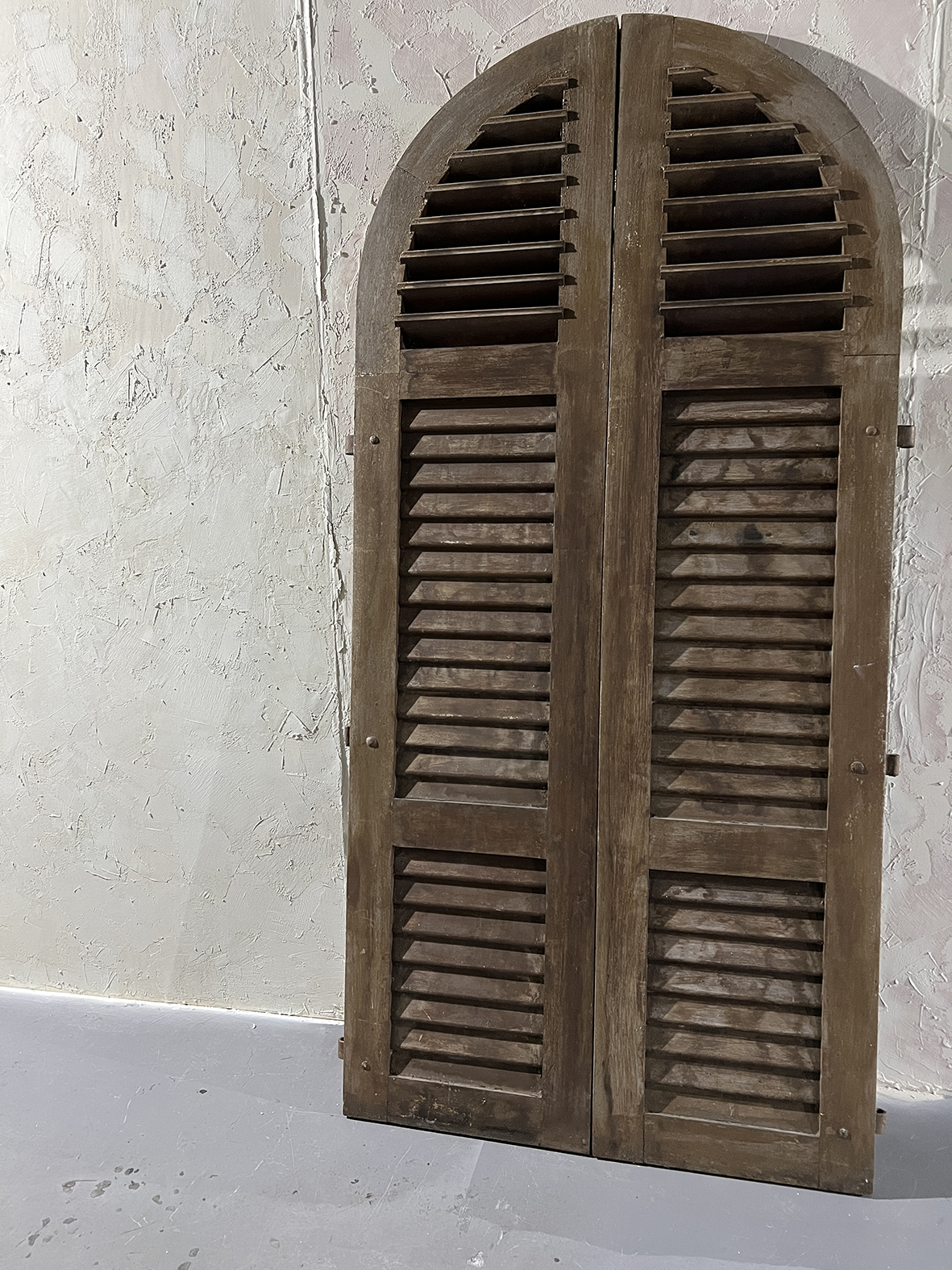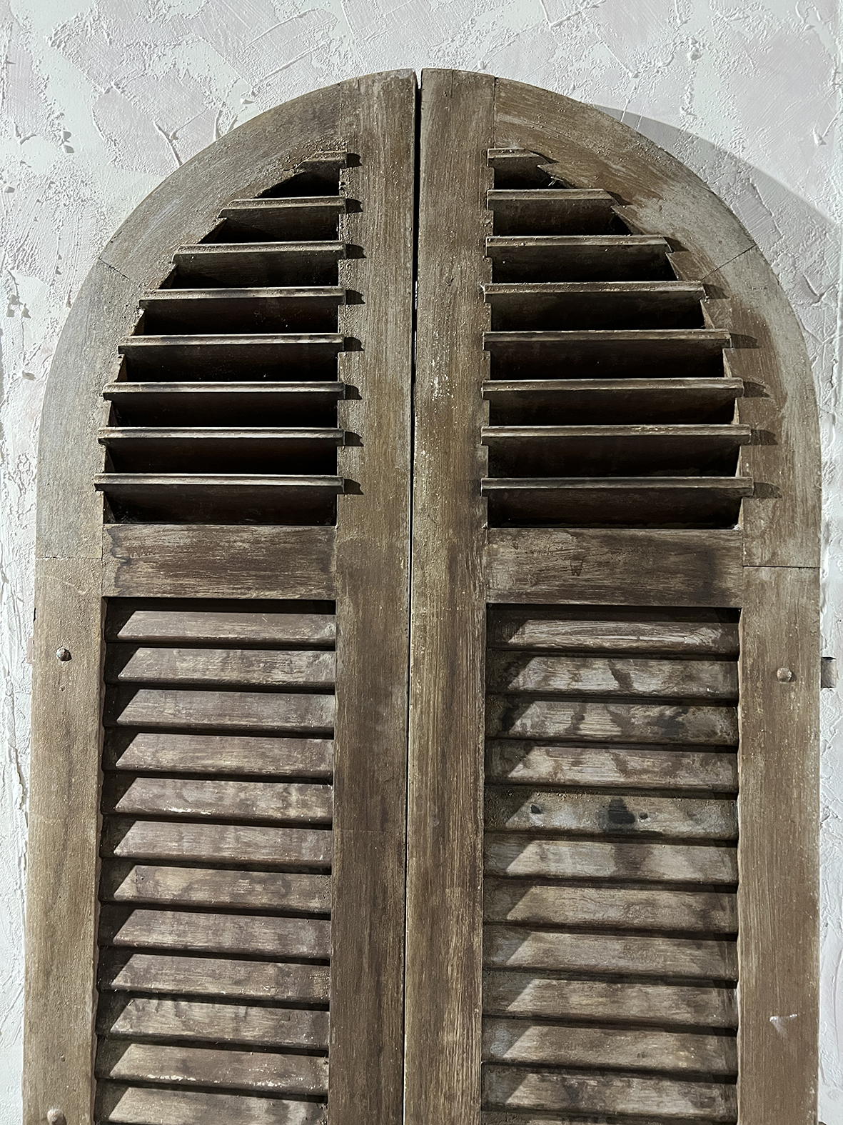 這組拱形百頁門片保留完整弧頂比例與傳統百葉結構,厚實原木搭配原始鐵件鉸鍊與插銷,表面呈現長年日照、風雨洗禮後的自然灰化層次,無法複製的歲月質感是19~20世紀南法建築中極具代表性的元素之一。