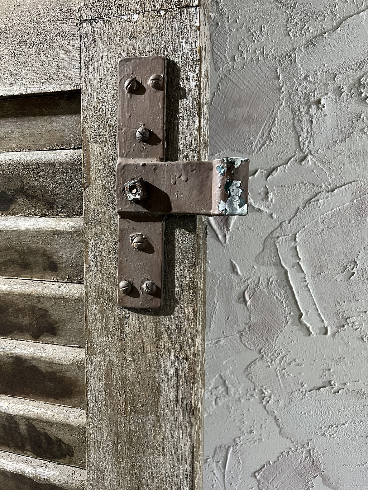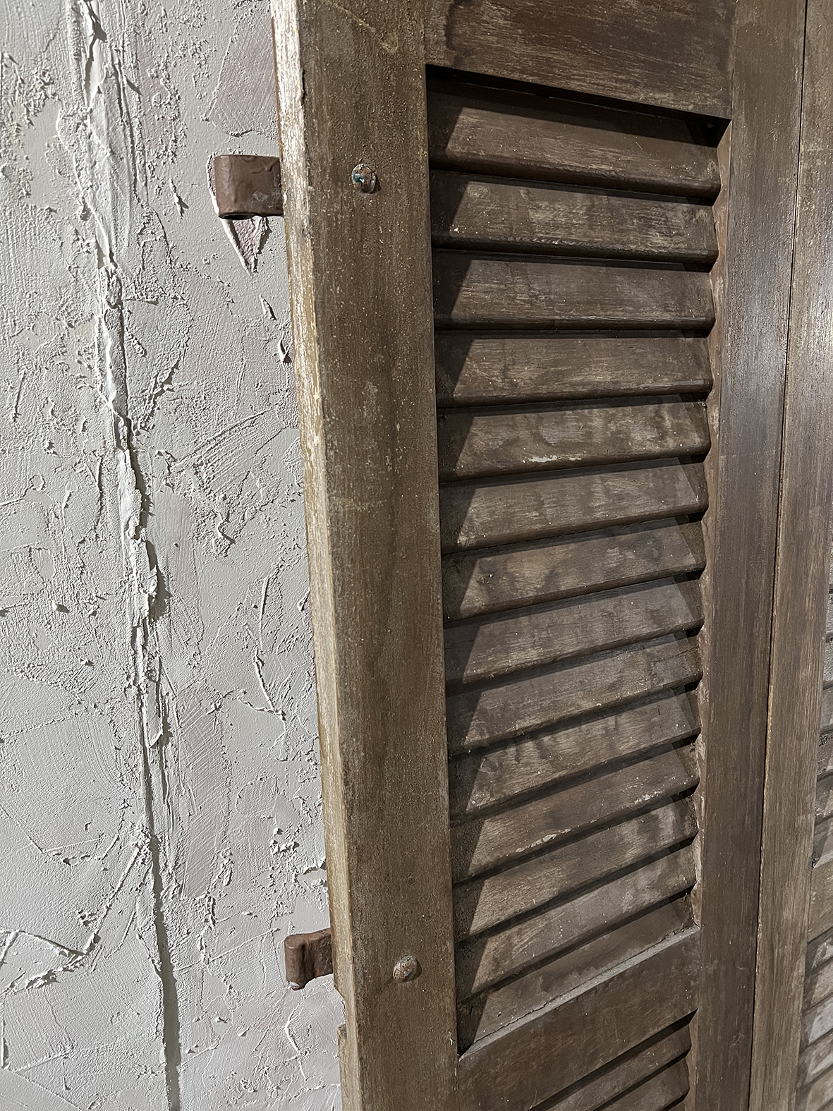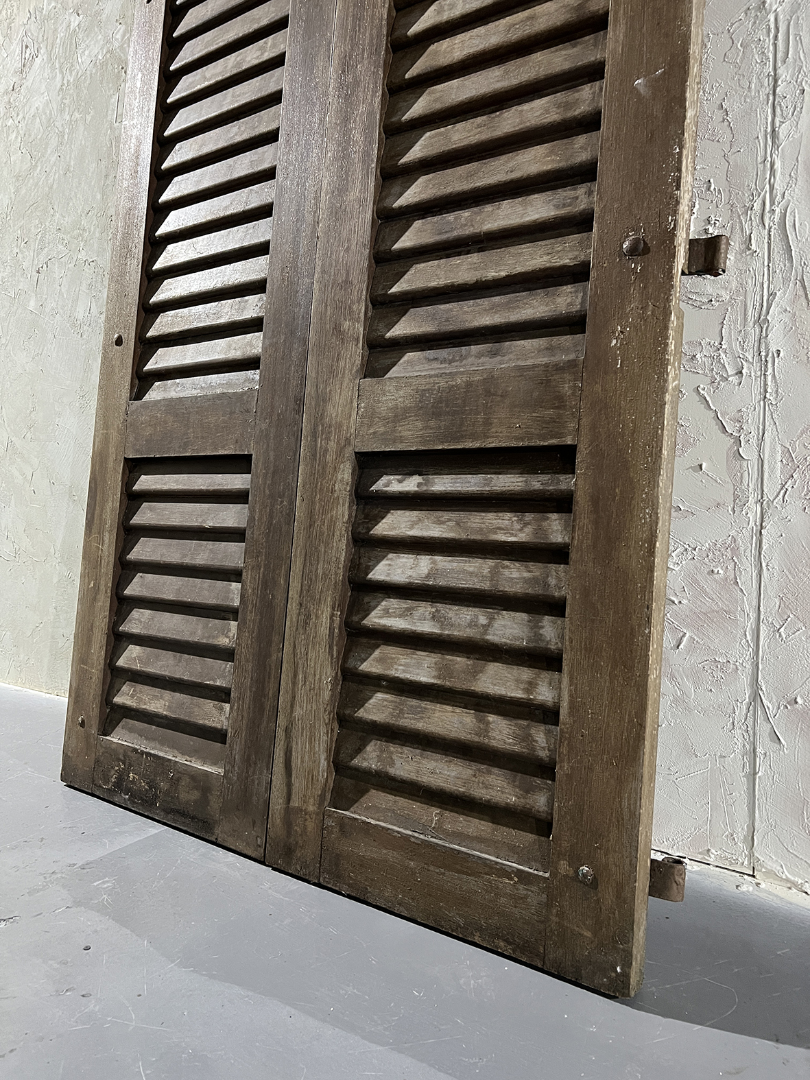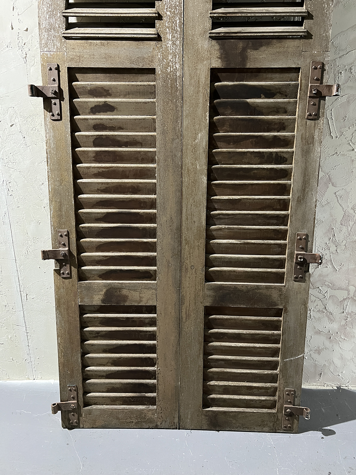 這組拱形百頁門片保留完整弧頂比例與傳統百葉結構,厚實原木搭配原始鐵件鉸鍊與插銷,表面呈現長年日照、風雨洗禮後的自然灰化層次,無法複製的歲月質感是19~20世紀南法建築中極具代表性的元素之一。