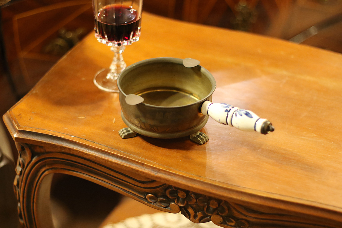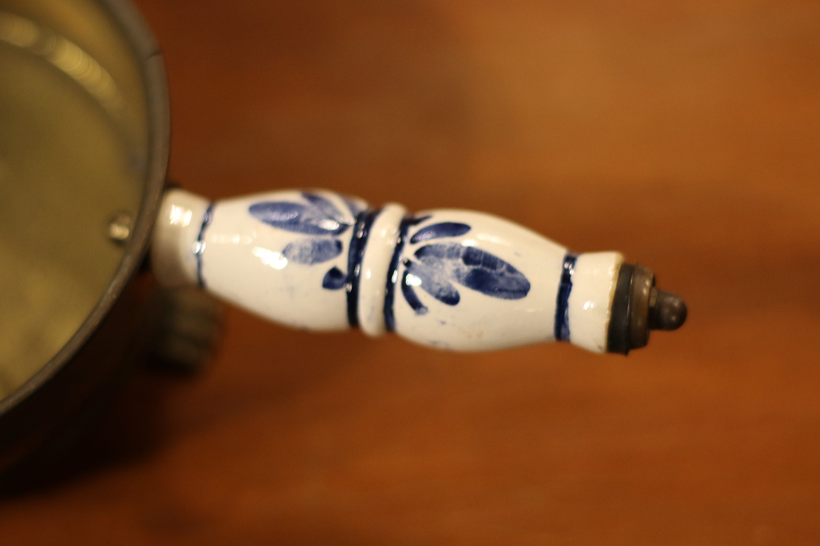 最大特色在於側邊的手柄部分,採用荷蘭聞名的台夫特(Delft)手工藍陶瓷,以白釉繪藍的花卉圖案點綴,與黃銅主體形成典雅對比。