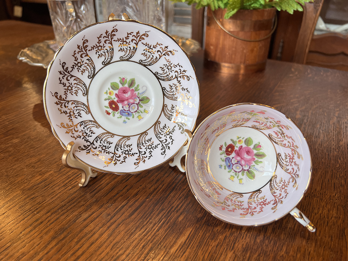 這組出自英國皇家御用品牌 Paragon Fine Bone China 的骨瓷茶杯碟組,以柔美的粉紫色為主調,內外以手繪花卉圖樣與24K金彩唐草紋飾環繞,細緻的鏤葉紋路在光下閃耀高雅光澤。杯底標記 “By Appointment to Her Majesty the Queen” 皇家御用徽章,顯示其為20世紀中期英國高級訂製茶具系列。