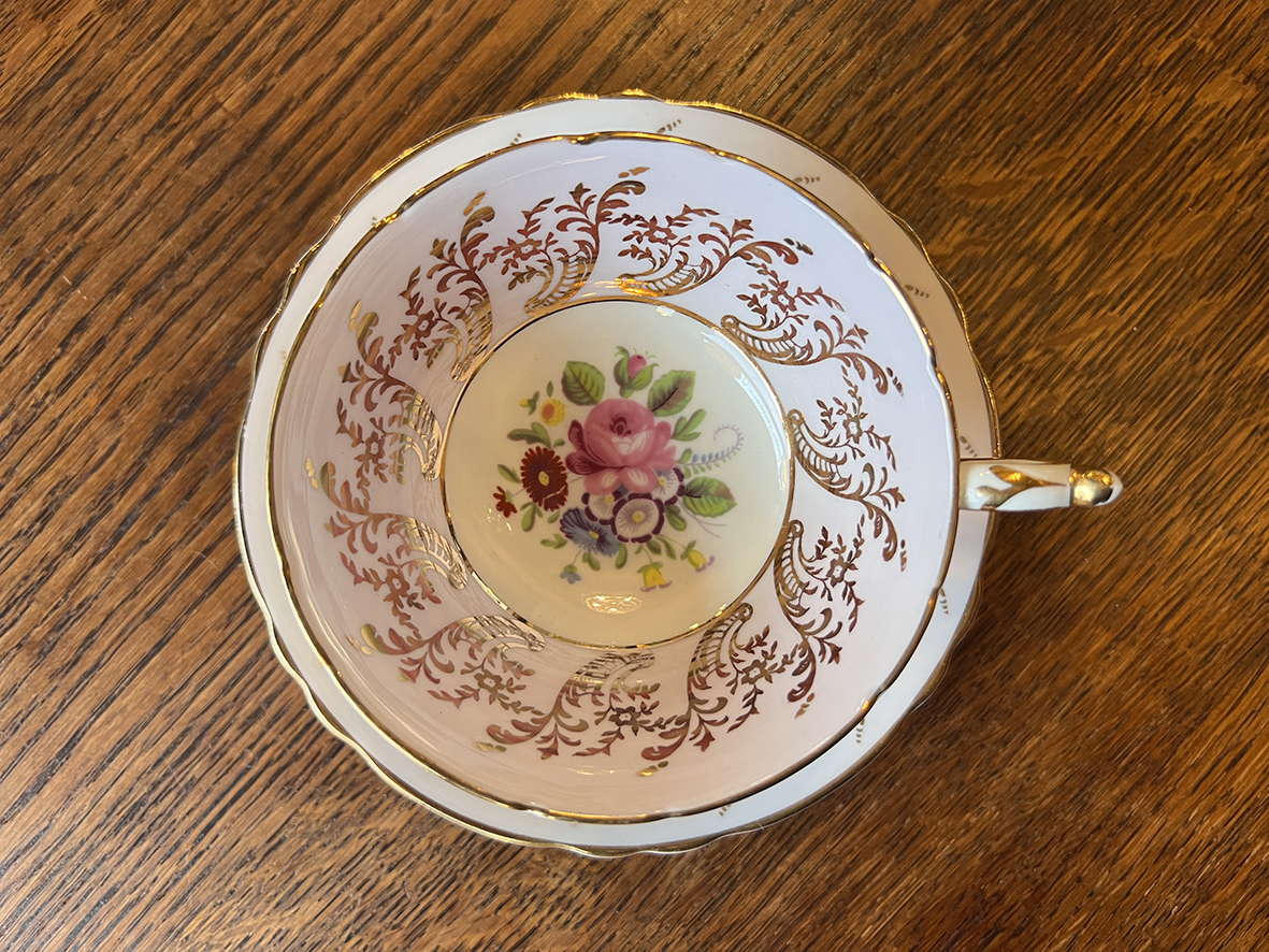 整體線條輕盈,杯身採寬口設計,襯托出內壁華麗金彩紋飾。花卉主題以英倫庭園的玫瑰、雛菊與紫羅蘭為靈感,色彩層次柔和細膩。手柄與邊緣以金彩勾邊,展現典雅與細節工藝的完美融合。每件均由工匠於Paragon工坊製作,展現當時英國瓷器黃金時期的精緻技藝。