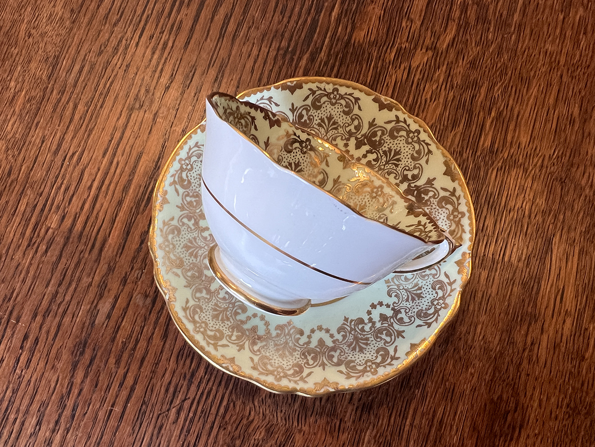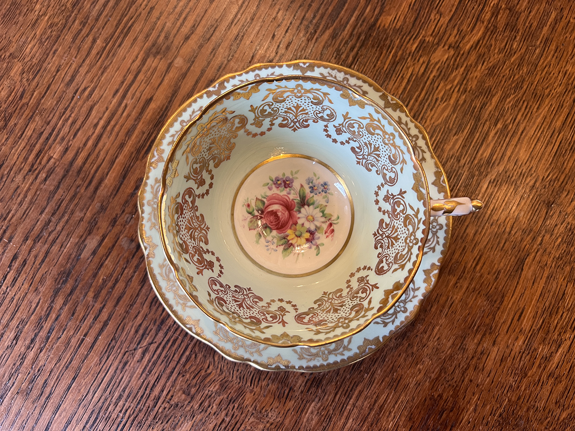 這組出自英國知名瓷廠 Paragon China Co. 的古董骨瓷茶杯碟組,以柔和的淺冰綠色釉底結合 巴洛克式金彩花紋,並於中央手繪玫瑰、雛菊與紫羅蘭花束,呈現出 20 世紀中期英式下午茶文化的極致華美。