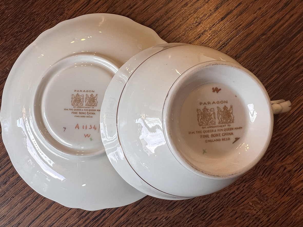 此款款式帶有 “By Appointment to H.M. The Queen & H.M. Queen Mary” 皇家委任標章,顯示其為 Paragon 於 1930–1950 年代期間供應英國皇室的高階骨瓷系列。