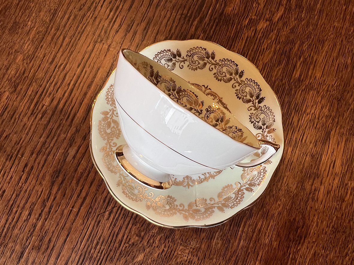 ☕️ 杯身為典雅的寬口造型,邊緣金線勾勒流暢輪廓,杯把採金色飾邊彎月造型,碟面亦以相同紋飾環繞,成對擺放時更顯高雅。無論是作為收藏、佈置或實際使用,皆能感受到那份屬於英式老件的精緻工藝。