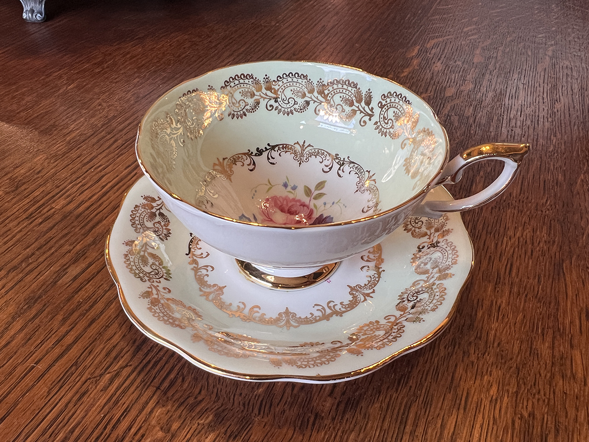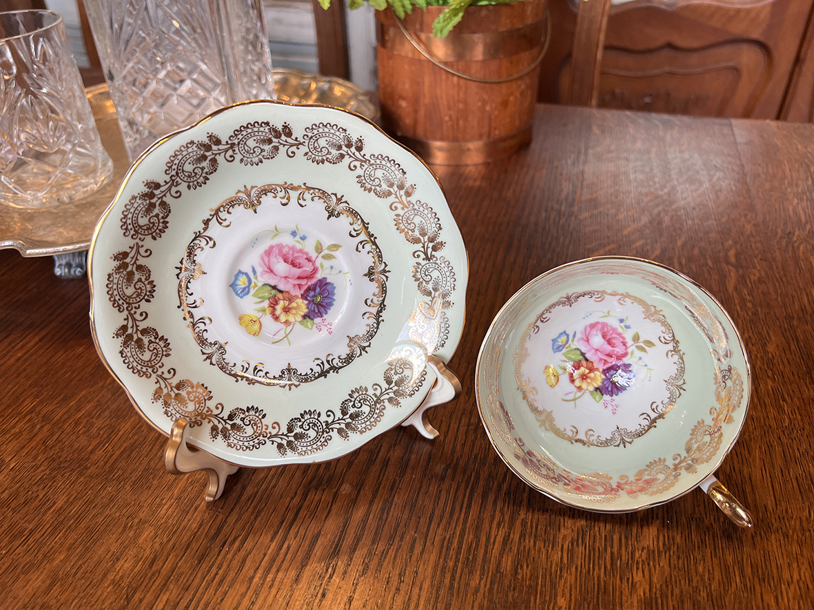 這組出自英國知名瓷廠 Royal Standard 的骨瓷茶杯碟組,以淺冰綠色為主調,內外環飾以精緻的巴洛克式金彩卷葉花邊,中央手繪花卉圖案以玫瑰、矢車菊與紫羅蘭為主,呈現出1940–50年代英式下午茶文化中最經典的柔美格調。
