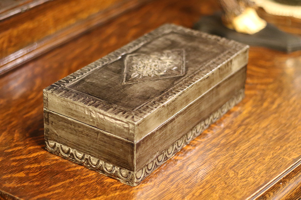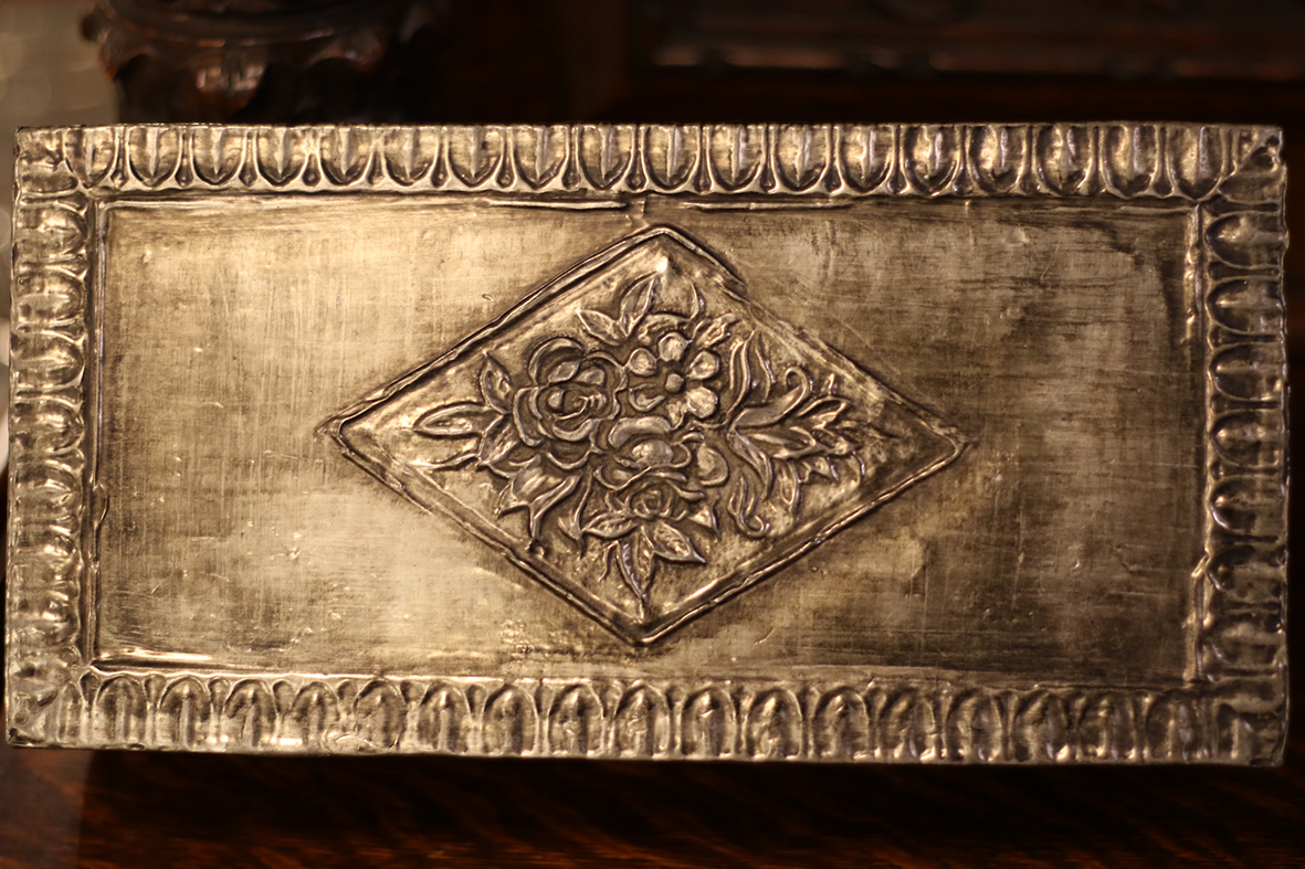這件來自西班牙的手工收藏盒,通體以錫板浮雕工藝打造,盒蓋中央飾有繁花圖案,邊框以連續弧形紋飾勾勒,整體呈現濃厚的歐洲工藝裝飾風格。