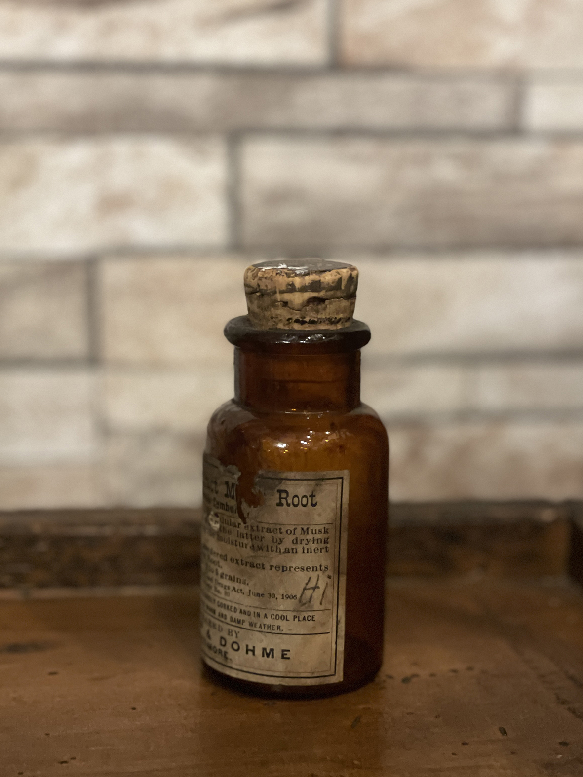瓶身以琥珀色厚玻璃壓製而成,底部壓印“S&D 842”為品牌製造編號。瓶身挺立勻稱,標籤完整度極高,上印“Powd. Extract Musk Root(Ferula Sumbul)”,標示其為當時醫藥用途的麝香根乾燥萃取物,具清晰劑量與用法資訊,反映20世紀初醫藥標示的標準化制度。