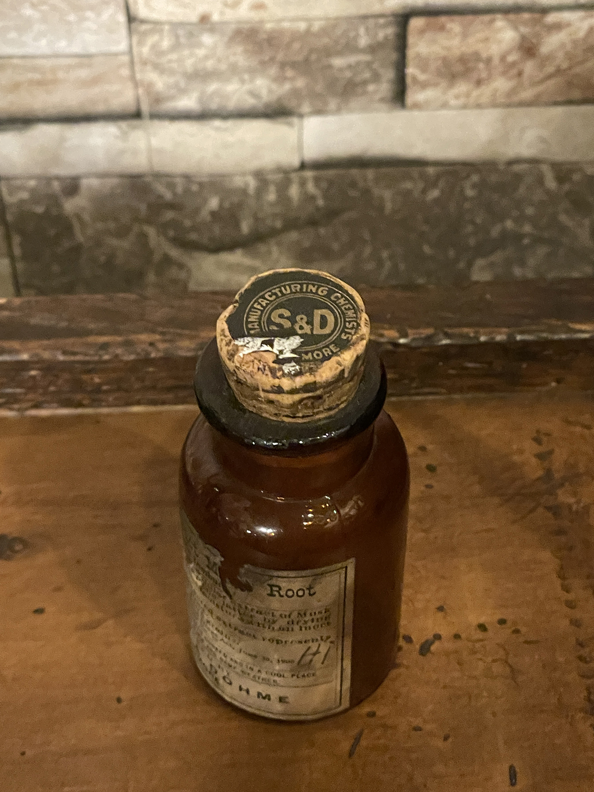 軟木塞上方仍帶有當時“S&D Chemists Baltimore”黑底金字標籤,保存難得。整體具藥劑、標本、製藥歷史等多重文化脈絡,非常適合作為風格空間佈置與收藏用途。