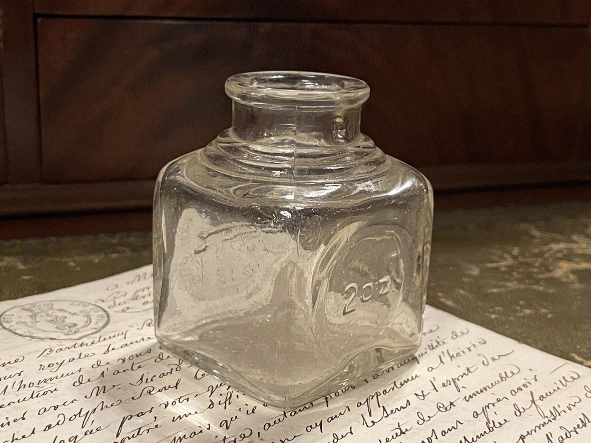 透明玻璃在自然光下映出細微波紋與氣泡,是早期模具吹製工藝的典型特徵。此類墨水瓶通常搭配金屬筆尖與羽毛筆使用,為書信、帳冊與報社編輯桌上不可或缺的實用品。如今,它更成為收藏家與攝影造景愛好者眼中,能瞬間營造復古書寫氛圍的經典物件。