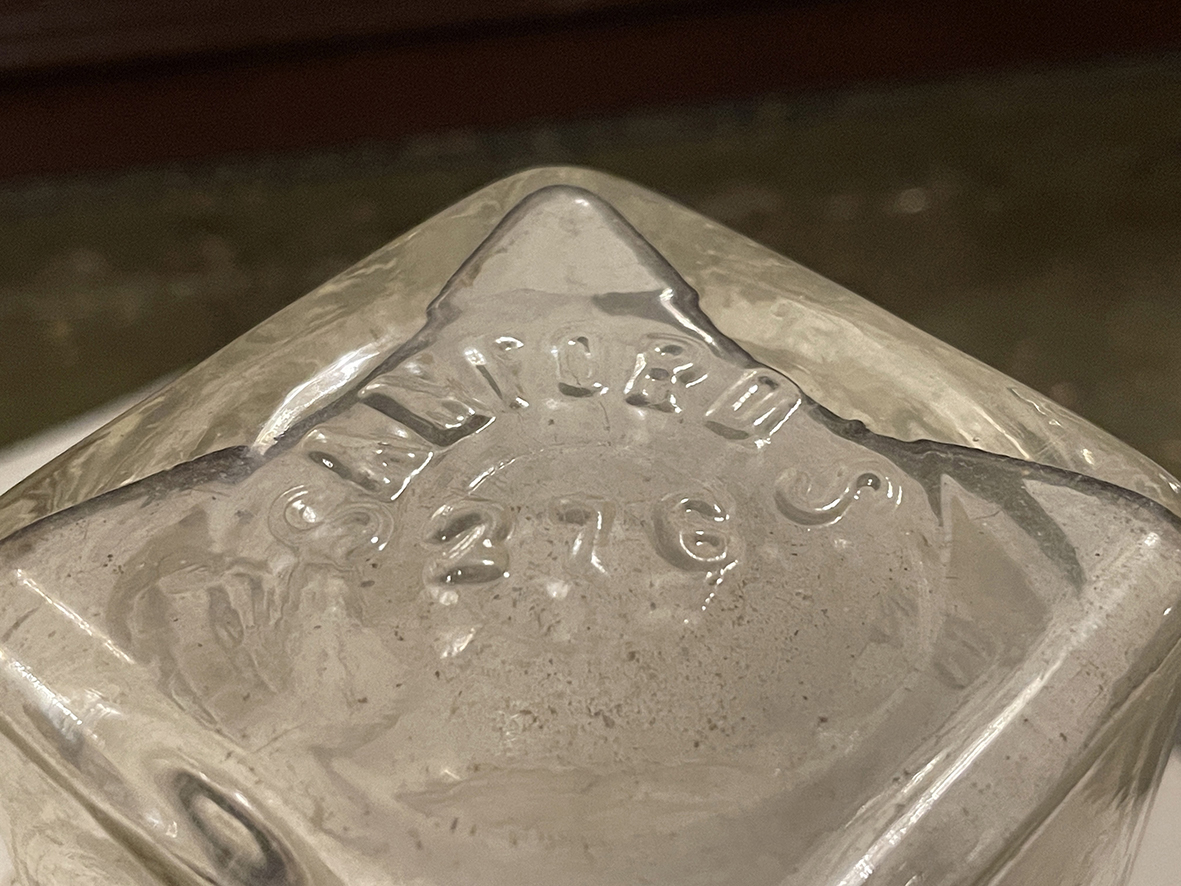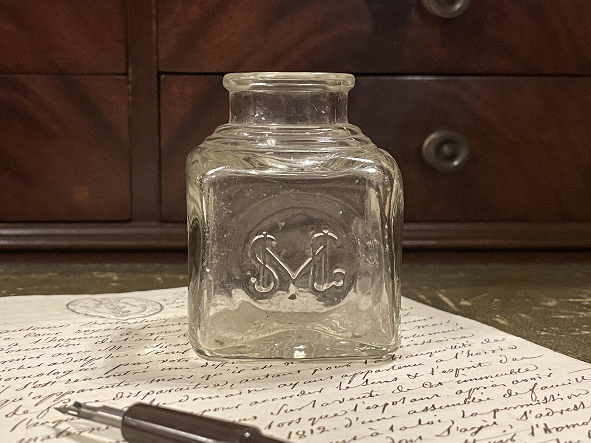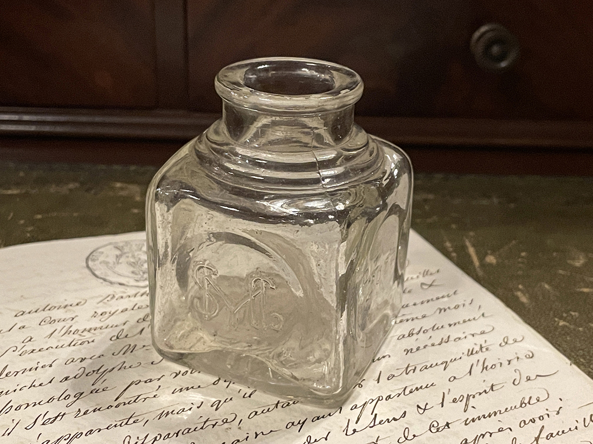 這只來自英國的百年古董厚玻璃墨水瓶,以堅實的透明玻璃手工吹製而成,瓶身厚重達145克,手感扎實。瓶體為方形收腰設計,瓶面壓印優雅字母「SM」字樣,底部則清晰可見製造商浮雕標記 “SALVICROS 276”,為20世紀初英國的文具與製墨工坊出品。