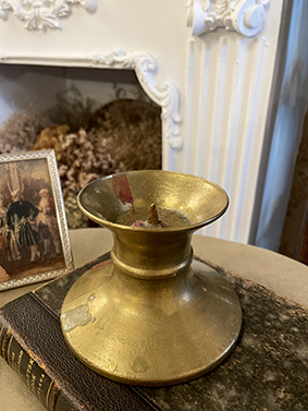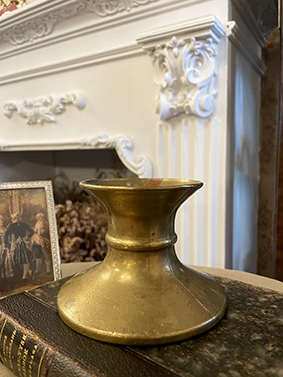 這件來自法國的古董黃銅蠟燭台,以實心黃銅手工打造,呈現渾厚而穩重的質感。簡潔的圓柱狀設計搭配外展的底座,讓整體線條俐落而不失古典韻味。台面中央設有固定燭芯的尖釘,能牢固支撐蠟燭,避免傾倒。