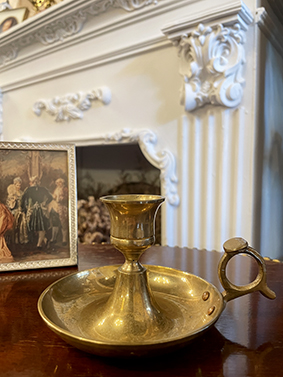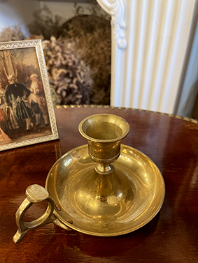 燭台造型簡潔,線條優雅,搭配圓盤底座與手持環設計,方便隨身提攜,典型呈現維多利亞時期常見的夜間照明器物。