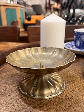 這件來自法國的手工古董黃銅蠟燭台,以花形托盤設計呈現出柔美的律動感。實心黃銅材質使其份量厚實,底座採取雕塑般的立體線條,宛如綻放的花朵,優雅而堅固。中央附有固定燭釘,可牢牢穩住柱狀蠟燭,兼具實用性與藝術感。