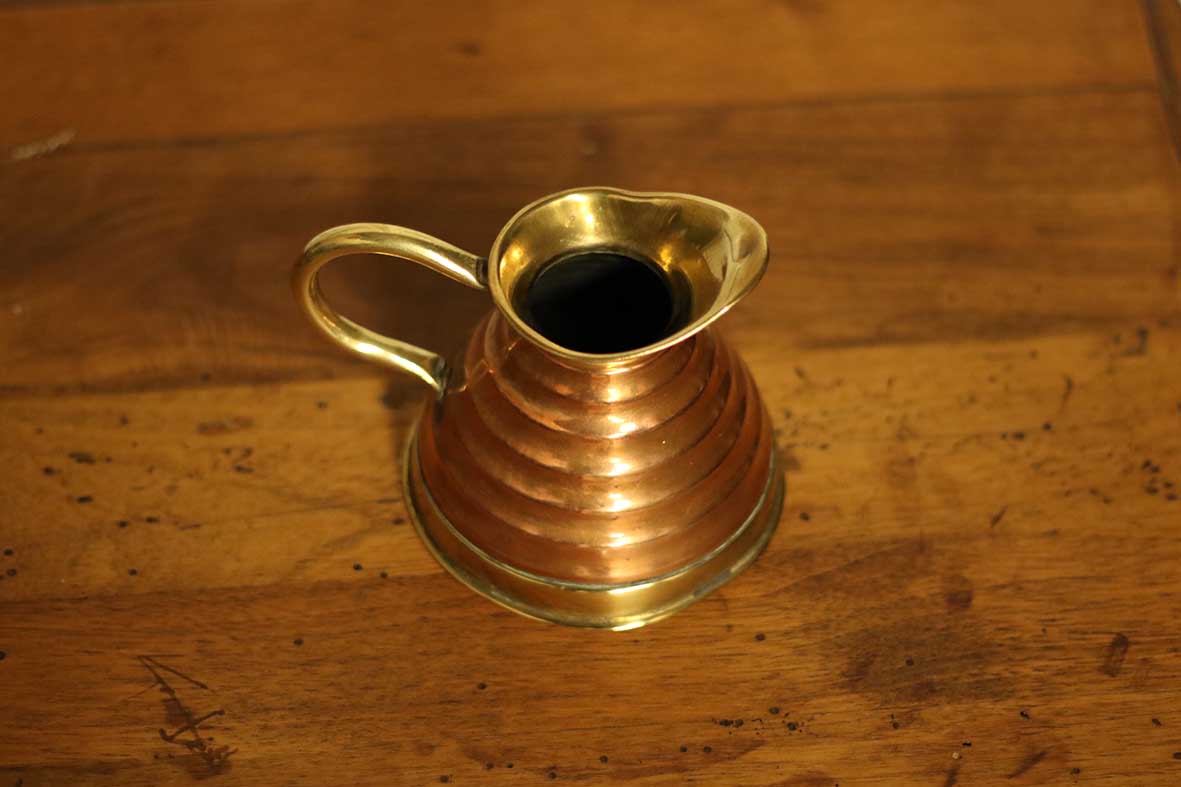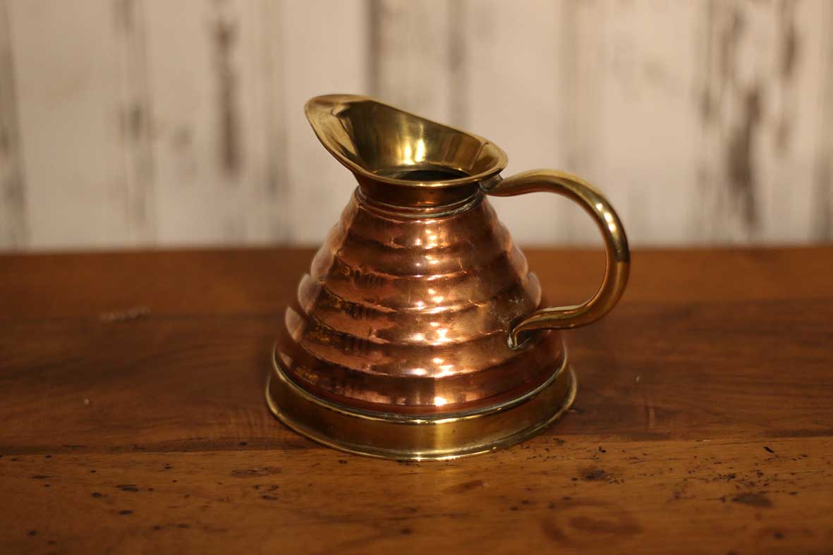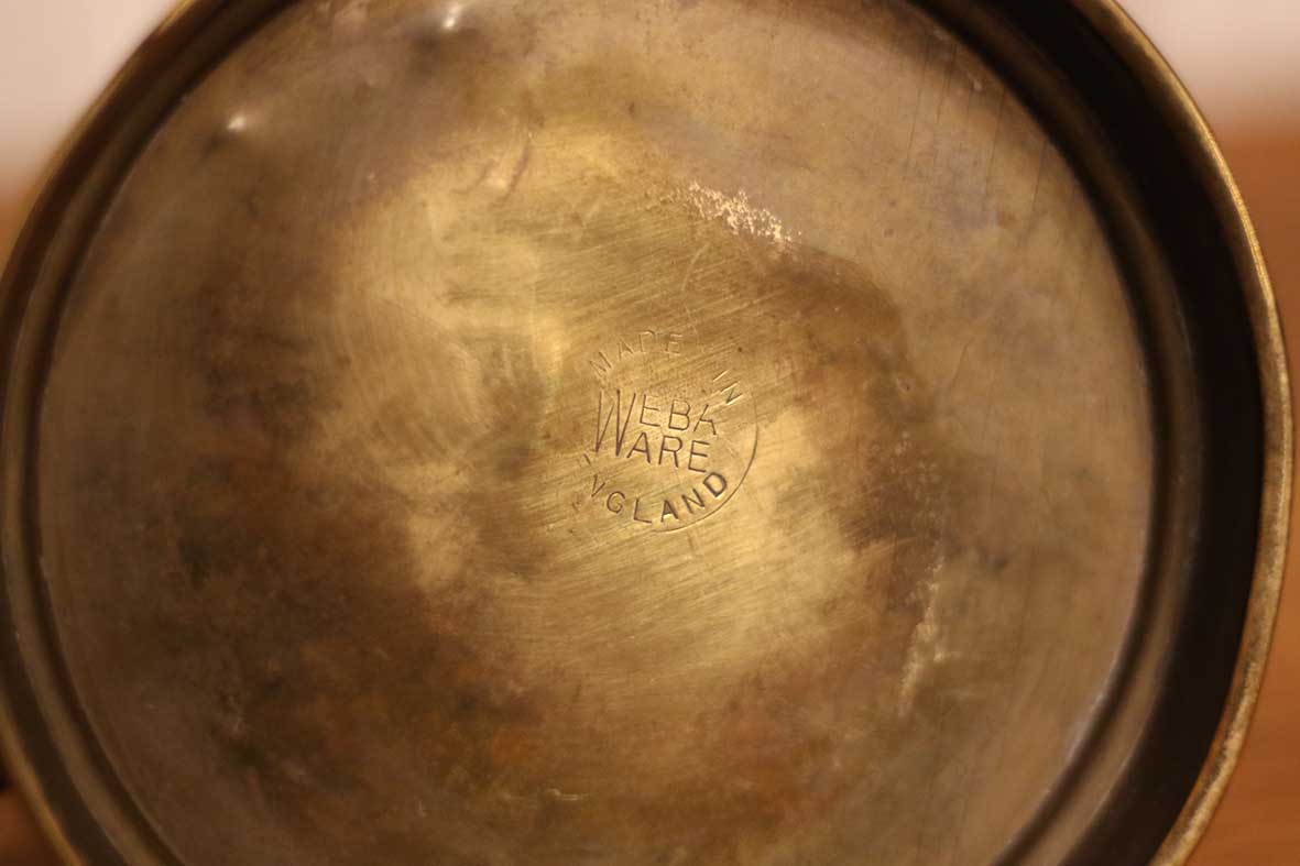 這件來自 英國 Webb Ware 的手工水壺,製於 20 世紀中期,採用 紅銅與黃銅雙色金屬打造,外壁呈現螺旋狀敲擊紋理,底部鋼印 「WEBB WARE – MADE IN ENGLAND」 商標。壺身內層以錫塗層處理,可正常盛裝水或飲品,兼具實用與裝飾價值。