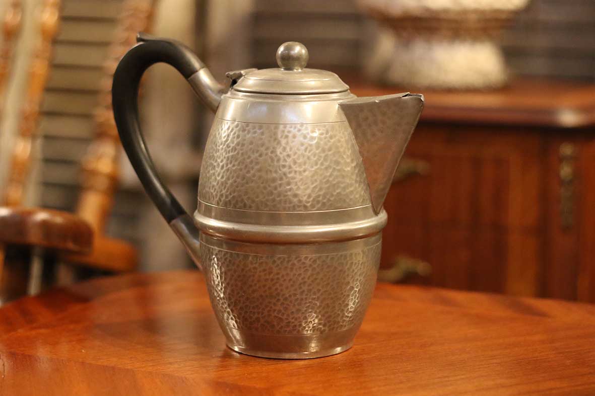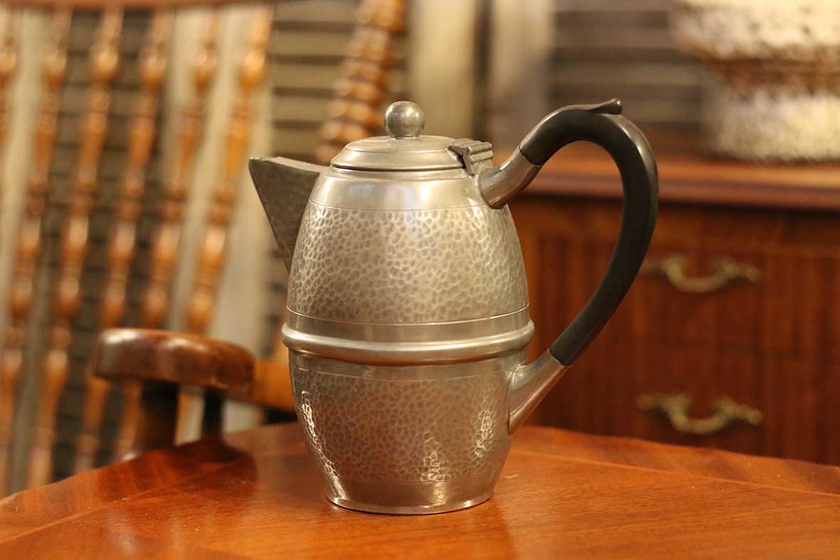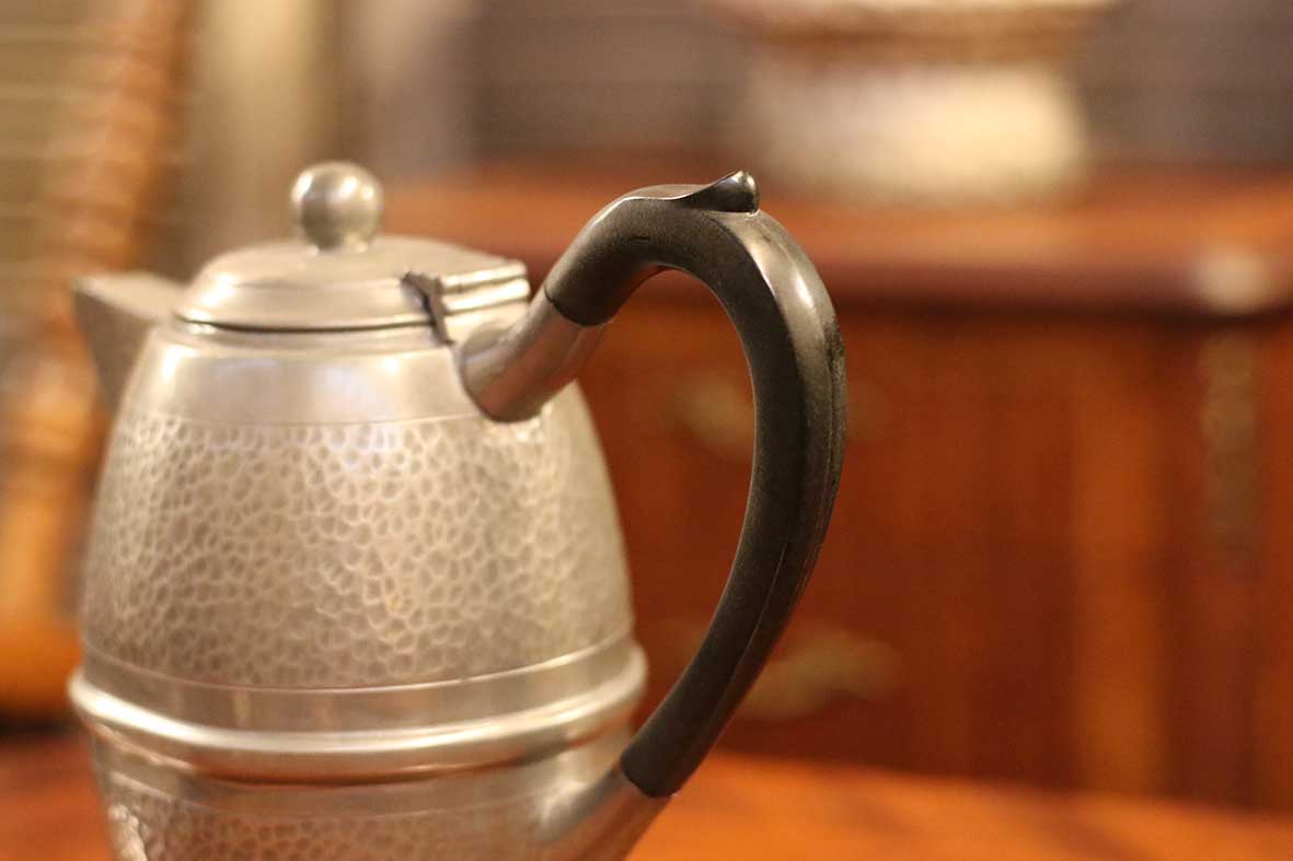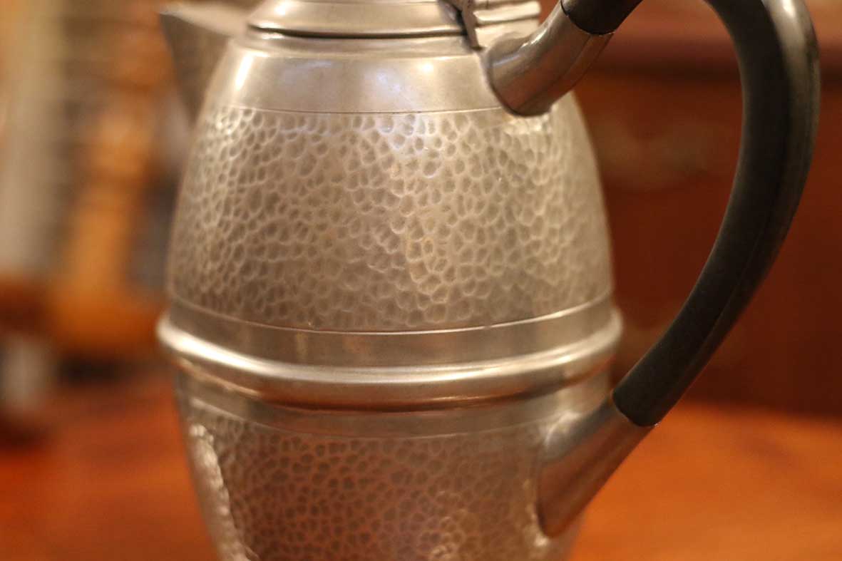 這件英國老件純錫壺以手工鎚打紋理打造壺身,呈現細密的凹凸光影,每一面都能看到工匠敲擊的節奏感。壺柄為烏木材質,溫潤深色帶出英式器物的穩重氣息,線條修長優雅,握感舒適。